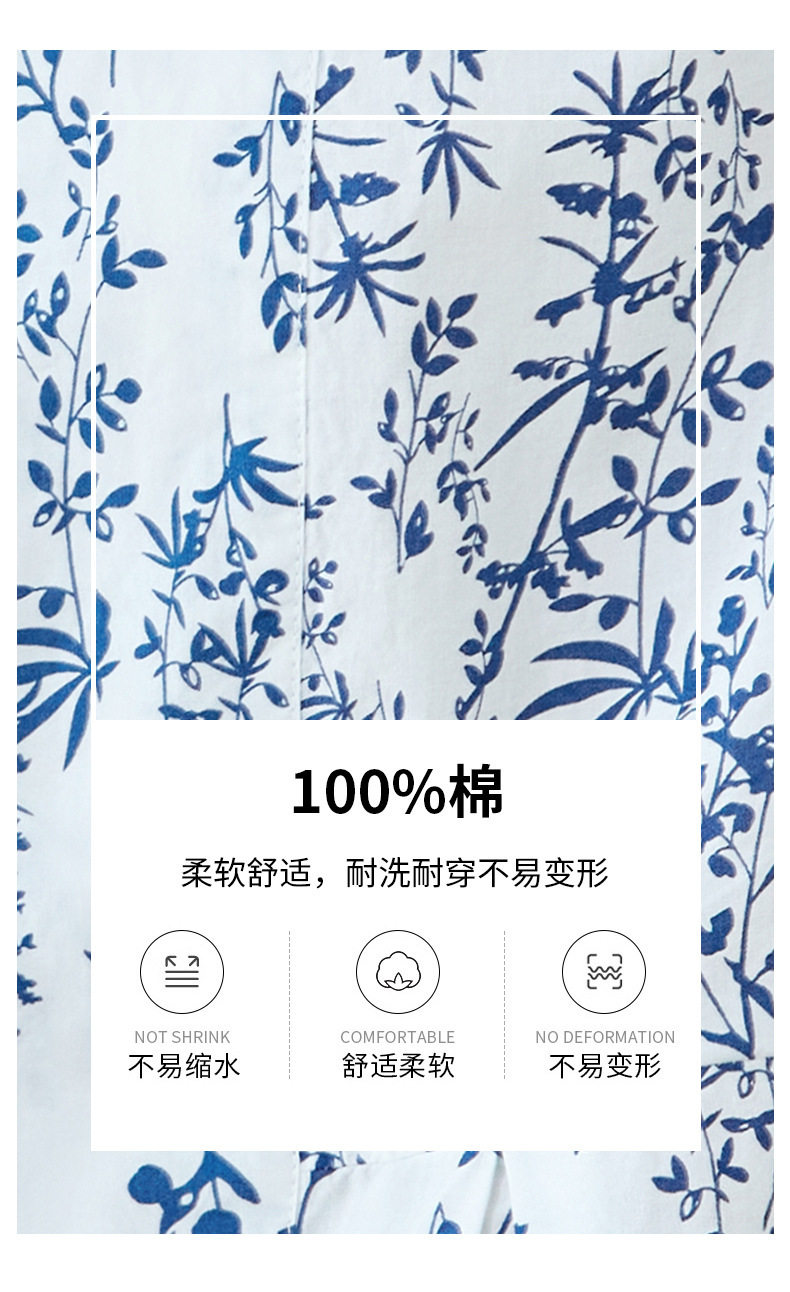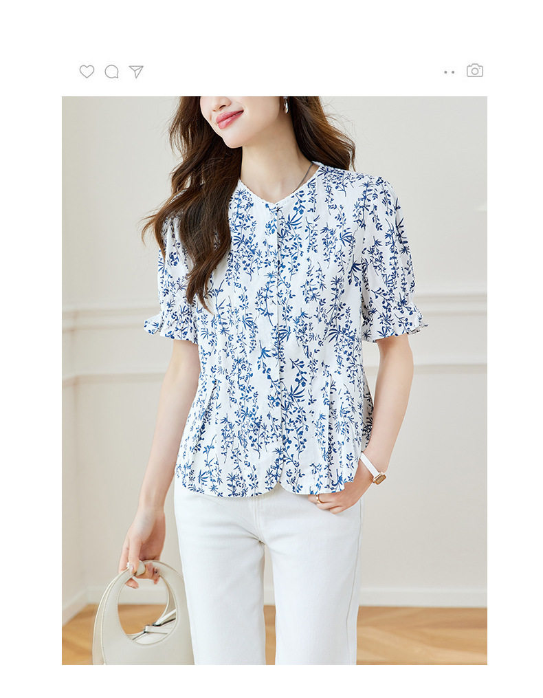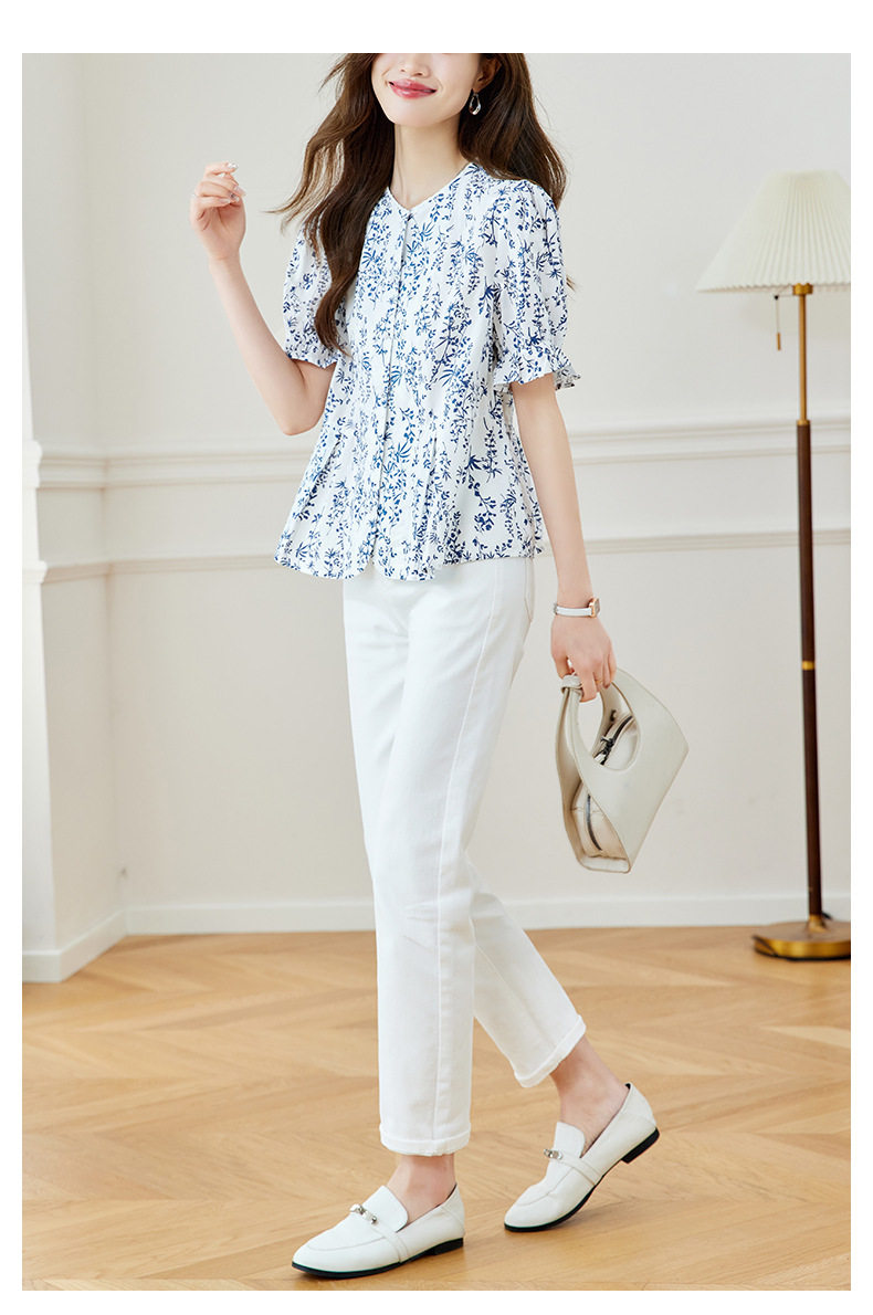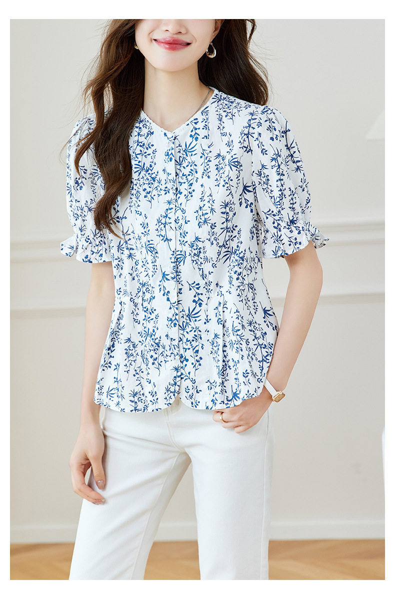 新中式印花衬衫青花瓷短袖上衣女夏季薄款纯棉别致衬衣女 MJ-44085