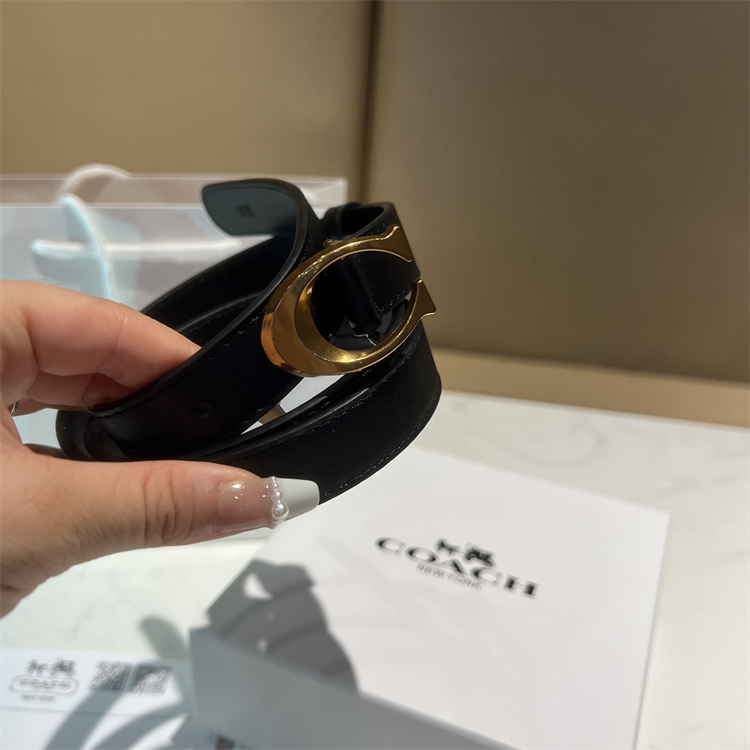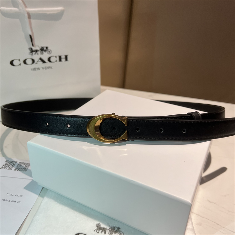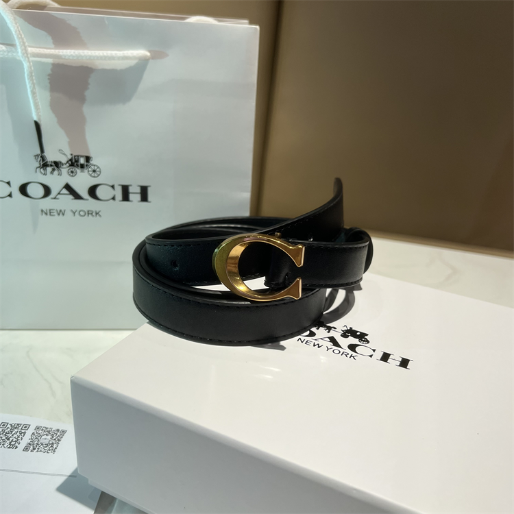COACH 蔻驰女款腰带礼盒 腰带头五金是进口精钢材 哑光金色的腰头有复古的感觉 ,牛皮的带身 ,在经过针扣压印工艺,手感更佳突出!质感十分细腻 绝对的经久耐用,两面颜色不同,皮带身宽度2.5厘米 总长度100,可打孔 礼盒包装,十分百搭 简约大方 又尽显精致 也可以做上衣腰带