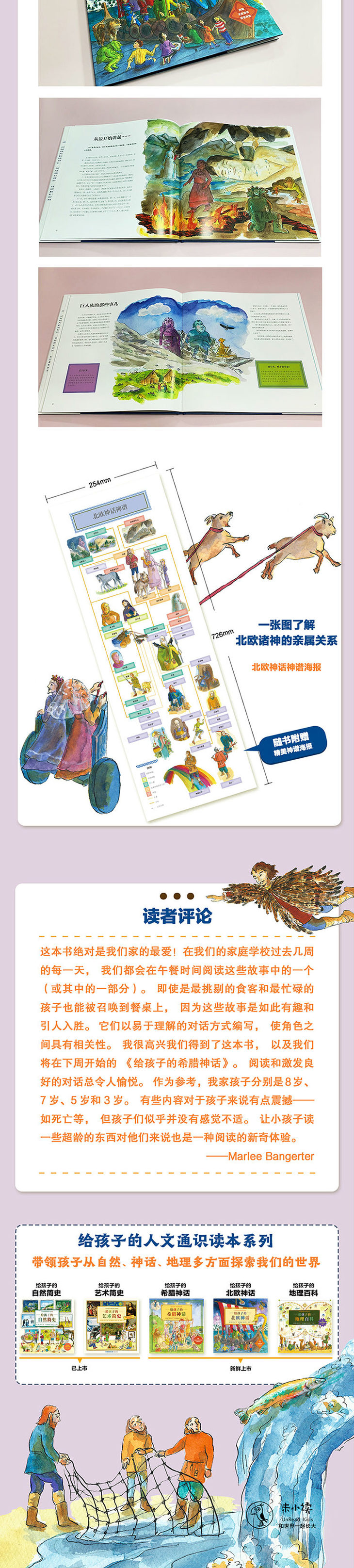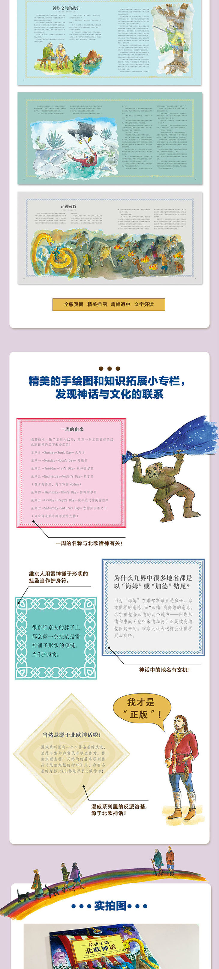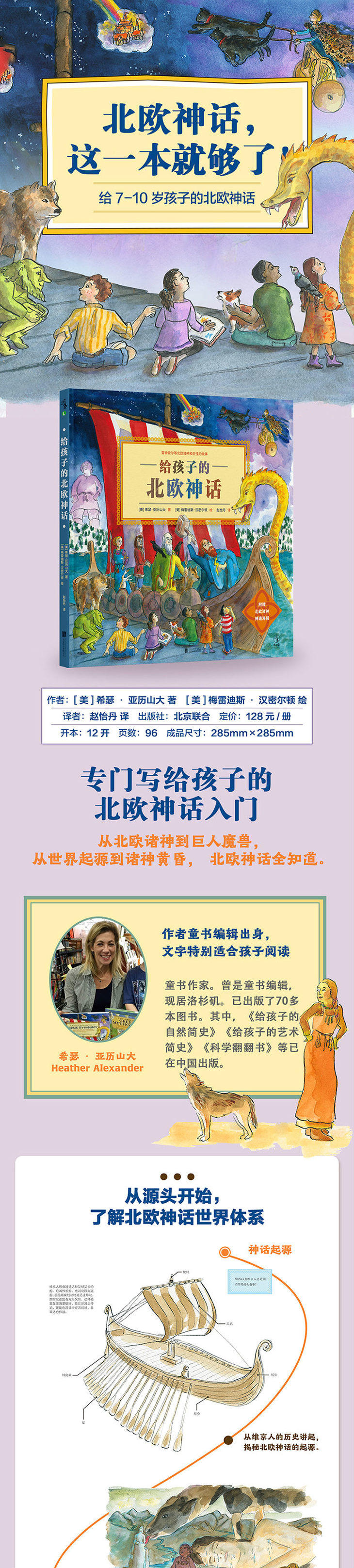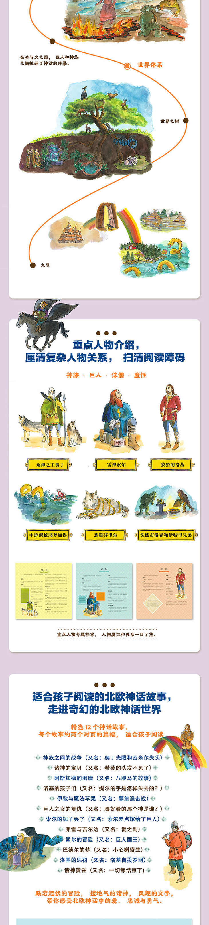 这是一本给5-10岁孩子阅读的有关北欧神话的科普读物。这本书将带领孩子了解北欧神话的起源、著名神话人物及发生在他们身上的有趣故事。这里有性格和能力各异的诸神,如能看到未来的奥丁、勇猛战士雷神索尔、机智狡诈的洛基等,有丑陋但强大的巨人族,还有技艺精湛的侏儒工匠,还有各种神奇的怪物,如长着长毛和翅膀、半蛇半龙的怪物尼德霍格,中庭海蛇耶梦加得等。这里还有各种有趣的故事,如雷神索尔的锤子是从哪儿来的、洛基是如何成为八腿马的妈妈,等等。这些故事中充满了爱、忠诚、勇气和正义,启发孩子对亲人充满爱意,对朋友忠诚,勇于为正义而战。这本书还介绍了星期的命名、银河、北极光等与北欧神话的关系。帮助我们了解古代维京人对万物由来的奇妙想象。