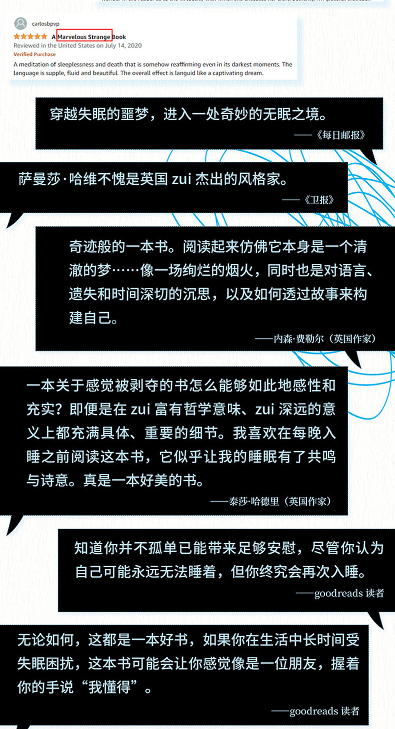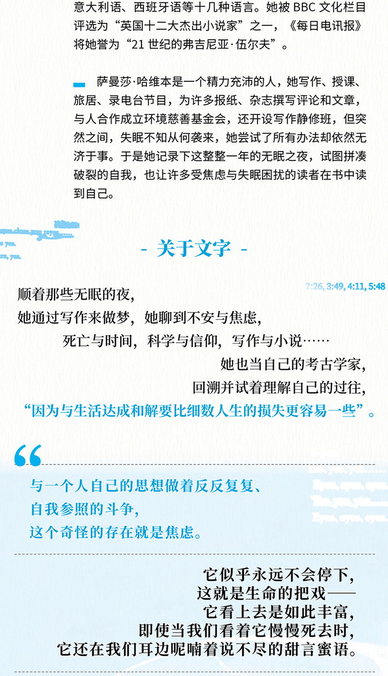 顺着那些无眠的夜,她通过写作来做梦,她聊到不安与焦虑、死亡与时间、科学与信仰、写作与小说……她也当自己的考古学家,回溯并试着理解自己的过往,“因为与生活达成和解要比细数人生的损失更容易一些”。