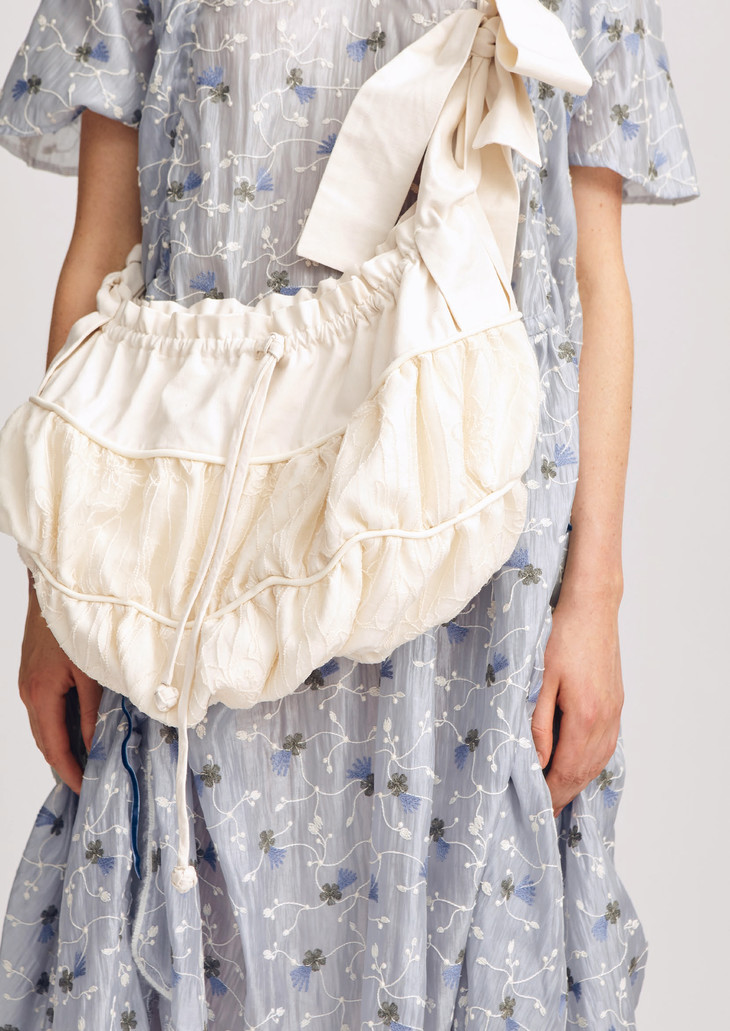 呼应本季主题「蓝鸟」,以鸟笼为灵感来源,用抽绳褶皱来呈现鸟笼的肌理。精致肌理的棉线刺绣丰富了层次感,搭配手工编织的绳结和球结,更添灵动。采用棉和亚麻混织面料制作,使包身富有自然的垂坠感,同时营造出纯净素雅的印象。
