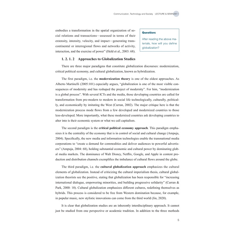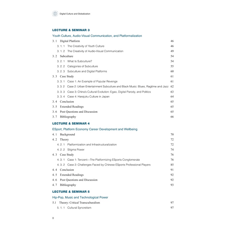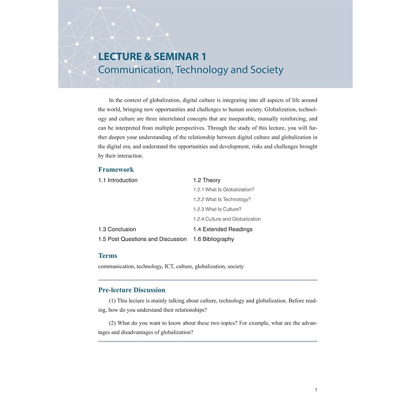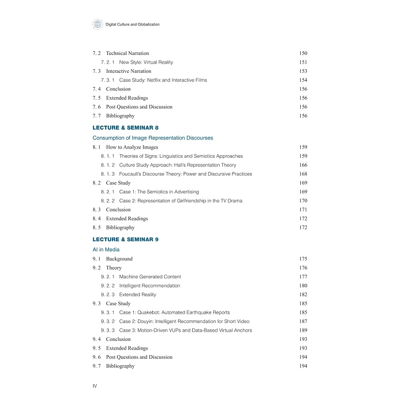 本教材聚焦于介绍全球城市连接、数字鸿沟、国家主义/民族主义、文化霸权、青年文化、亚文化、跨文化等相关理论知识和专业信息,并结合具有“中国文化走出去”和“国际文化在地化”双重属性的电子竞技、说唱、影视与视觉传达、人工智能、虚拟现实技术等数字叙事案例,多角度解读数字文化与国际化本体,掌握相关研究范式,引导我国学生批判性思考,提高文化自信,同时引导我校留学生“知华友华爱华”。 每章都围绕以下三条主线: (1)“数字叙事时代国际传播生态研究” (2)“国际本土化理论与实践探索研究” (3)“数字叙事时代中外多元主体形象塑造的比较研究”
