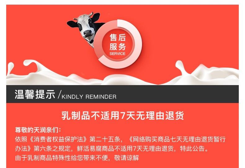 保证新鲜日期,新疆天润总厂配送下单后72小时内发货;酸奶属于短保质期商品,一经发货不支持退换货,改地址,如客户执意要求退改地址,产生的相关费用由客户自行承担,感谢您理解 !