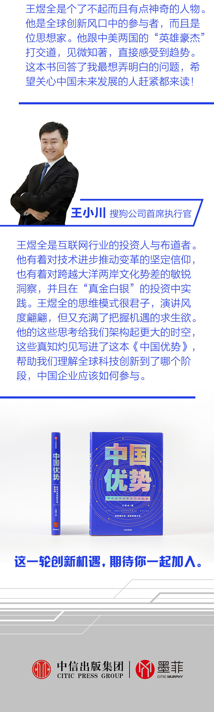 《中国优势:抓住全球创新生态新机遇》由海银资本创始合伙人、“得到”App课程主理人王煜全所著,率先从全球化和历史的宏观维度,系统梳理和阐述科技创新的发展轨迹,提出全球创新正进入生态时代。这是一场堪比“工业革命”的“科技创新革命”。本书不仅对全球创新生态的基本逻辑和规律进行了科学分析与判断,更对中国产业侧创新的独特优势做了详细解析。中国制造是全球创新生态的控制点,将决定并引领全球创新的未来。 通过阅读《中国优势:抓住全球创新生态新机遇》,你将获得理解科技创新的系统性思维,真正把握未来发展的趋势,掌握用科技和技术视角看世界的方法,抓住科技浪潮的新机会。
