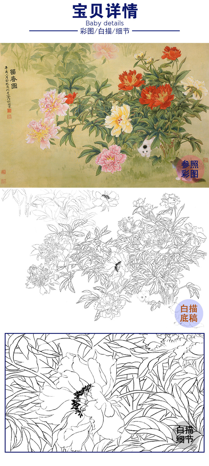横幅工笔花鸟猫咪白描底稿-俞致贞《留春图》-多种白描尺寸可选-JV02
