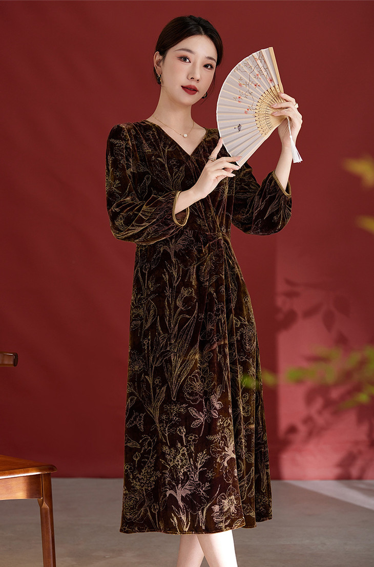 丝绒印花v领中长款优雅,重磅桑蚕丝连衣裙SM-82501829