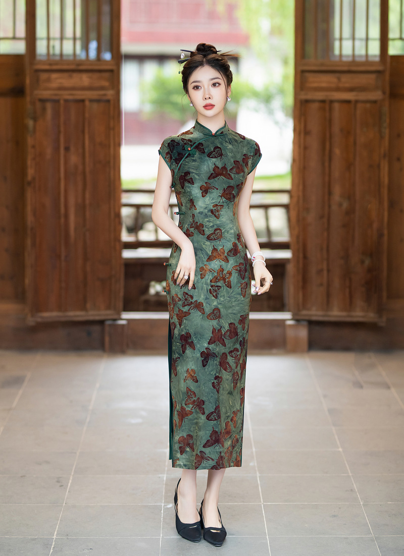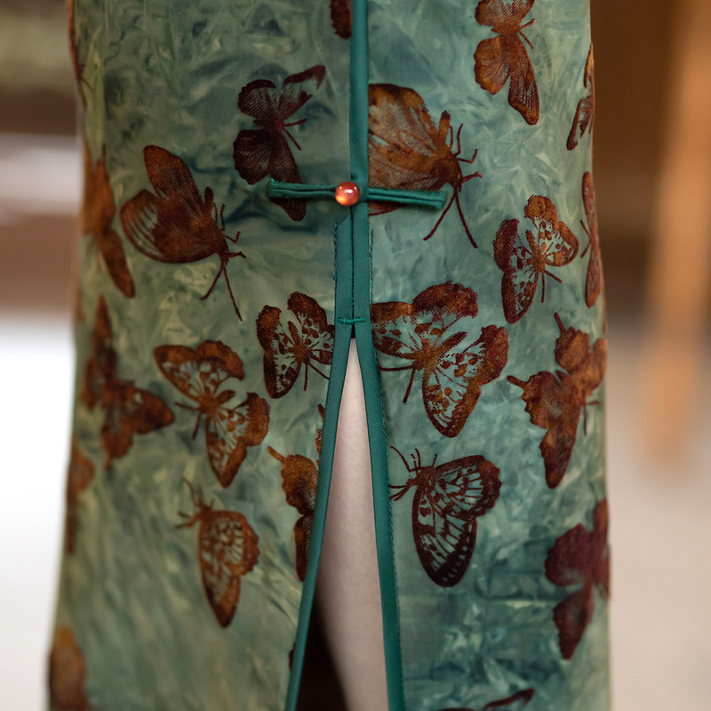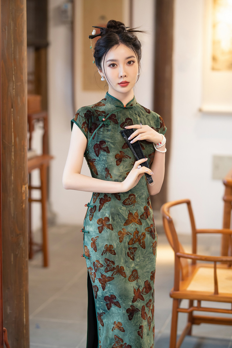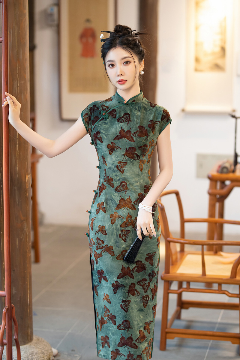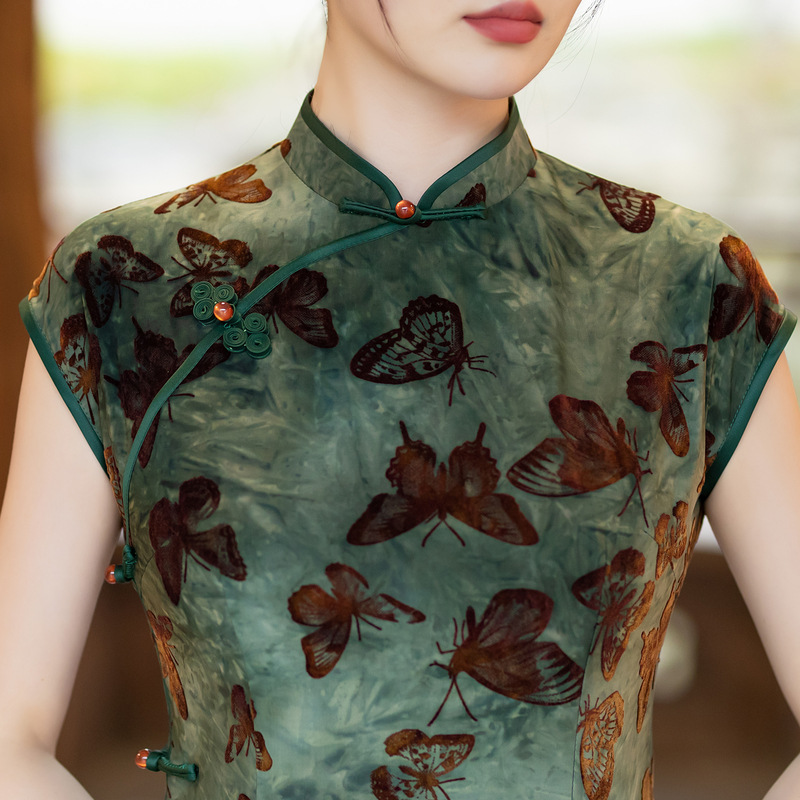 ZAYS-401植绒扎染旗袍2024夏季时尚年轻款修身老上海复古气质改良女装旗袍