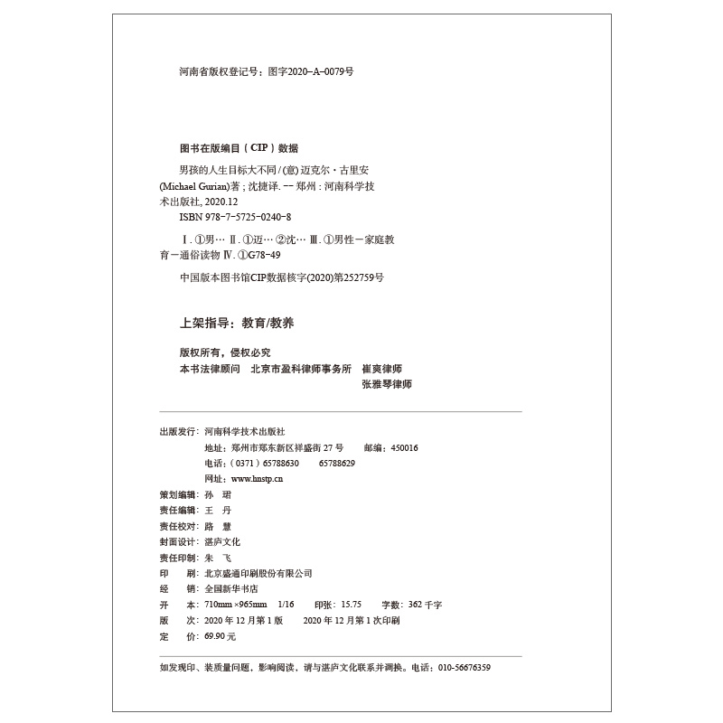 ●在这本书中,国际知名的男孩教育专家、性别科学领域先驱人物迈克尔·古里安以脑科学与神经生物学的研究为基础,结合自身40年的教育实践成果,详细阐述了一个男孩成长为男人的心理路径和不同阶段,总结为“英雄之旅的7个阶段”,同时研发出CORE模式及三重家庭体系,帮助父母有效激发男孩天性中的内在驱动力量,从小为男孩树立正确的价值观,帮助他们找到生存的重要性、生活的意义和人生的方向,成长为有责任、有担当的男子汉。