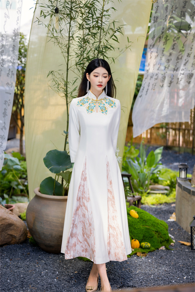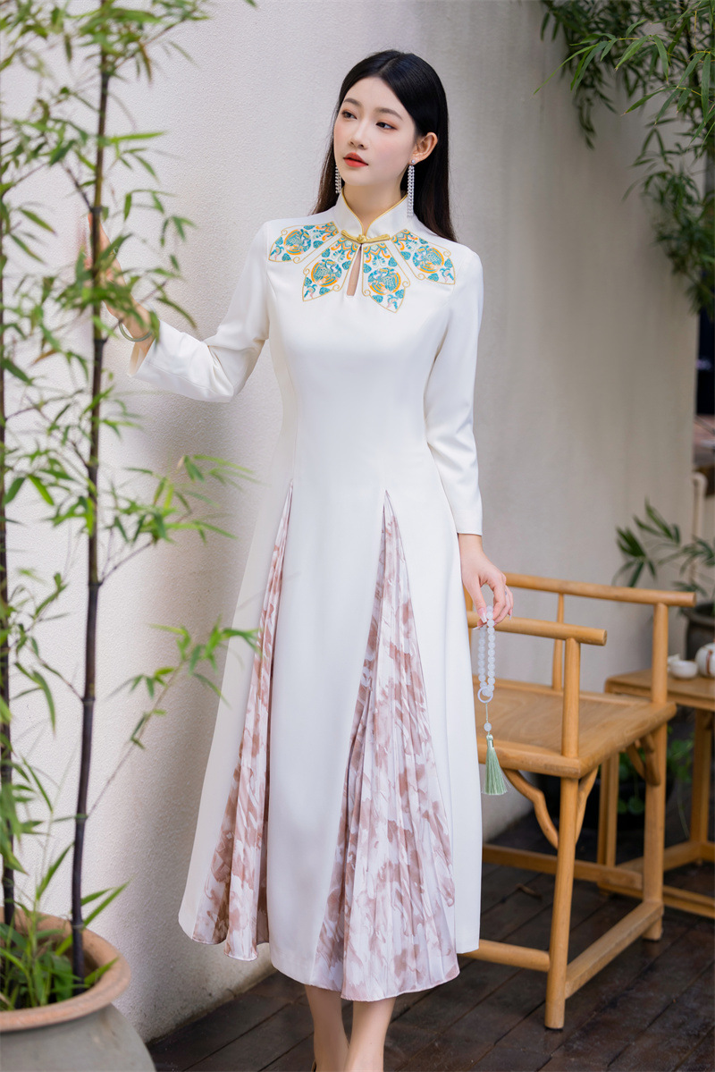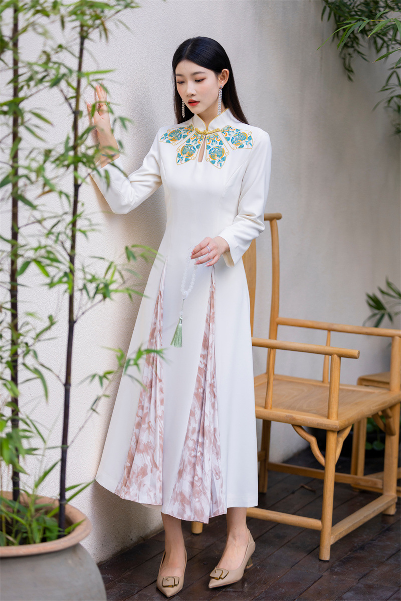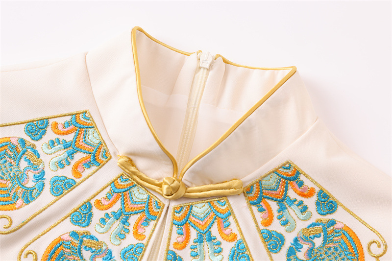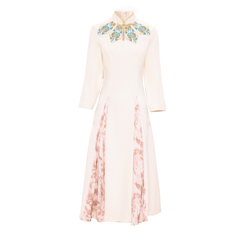 FLZD-23162波西米亚民族风刺绣花朵立领印花褶皱修身显瘦百搭长裙连衣裙女