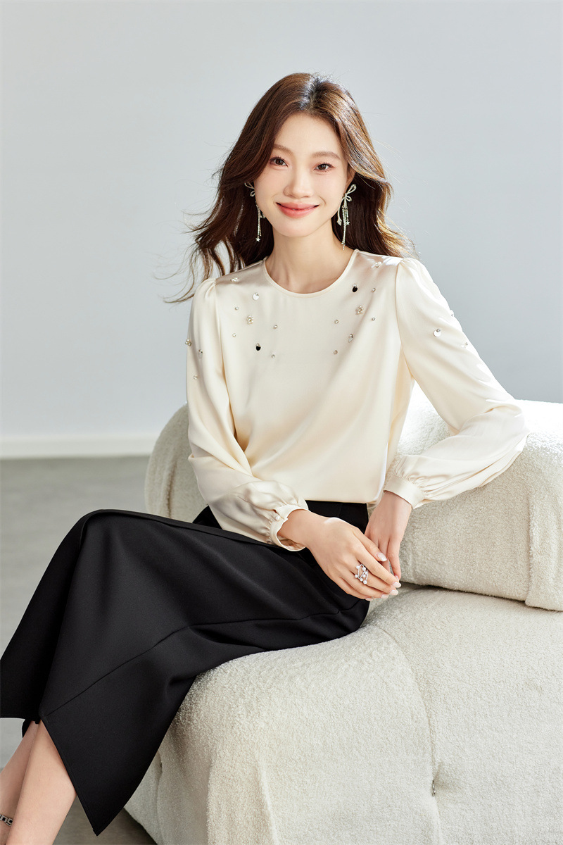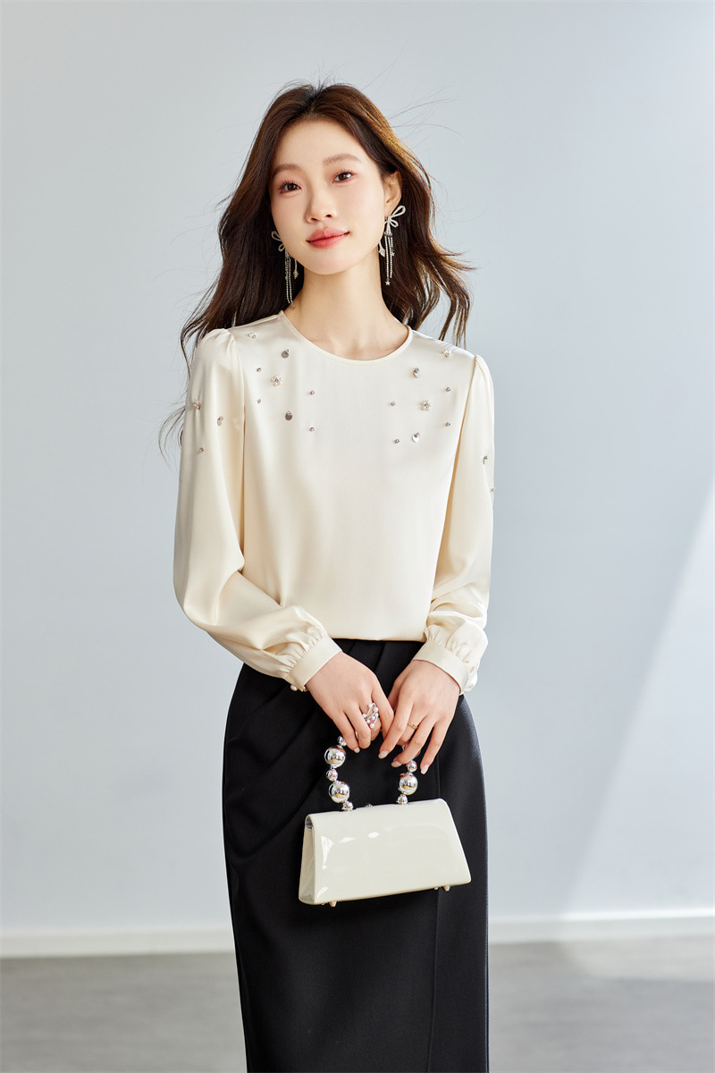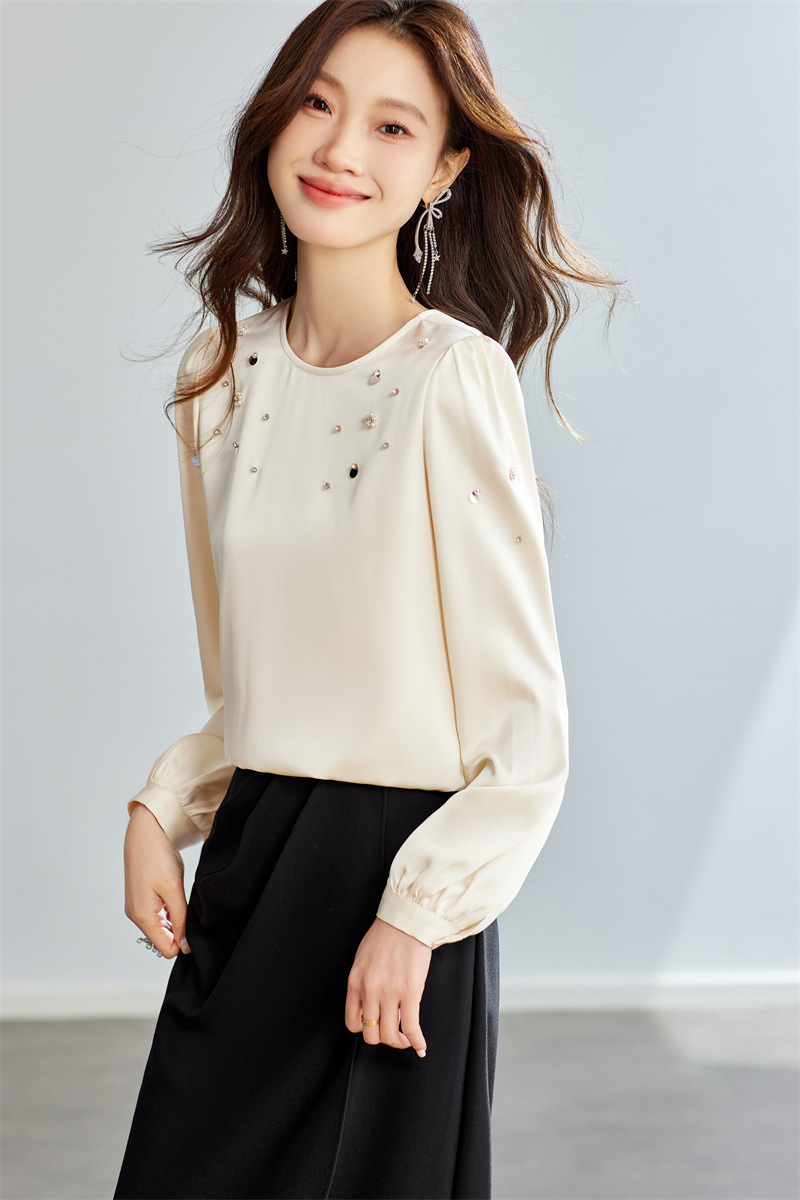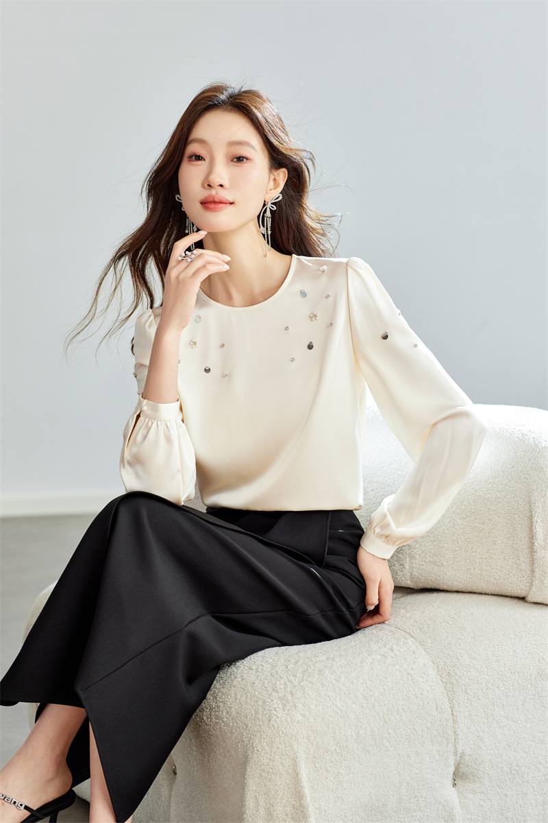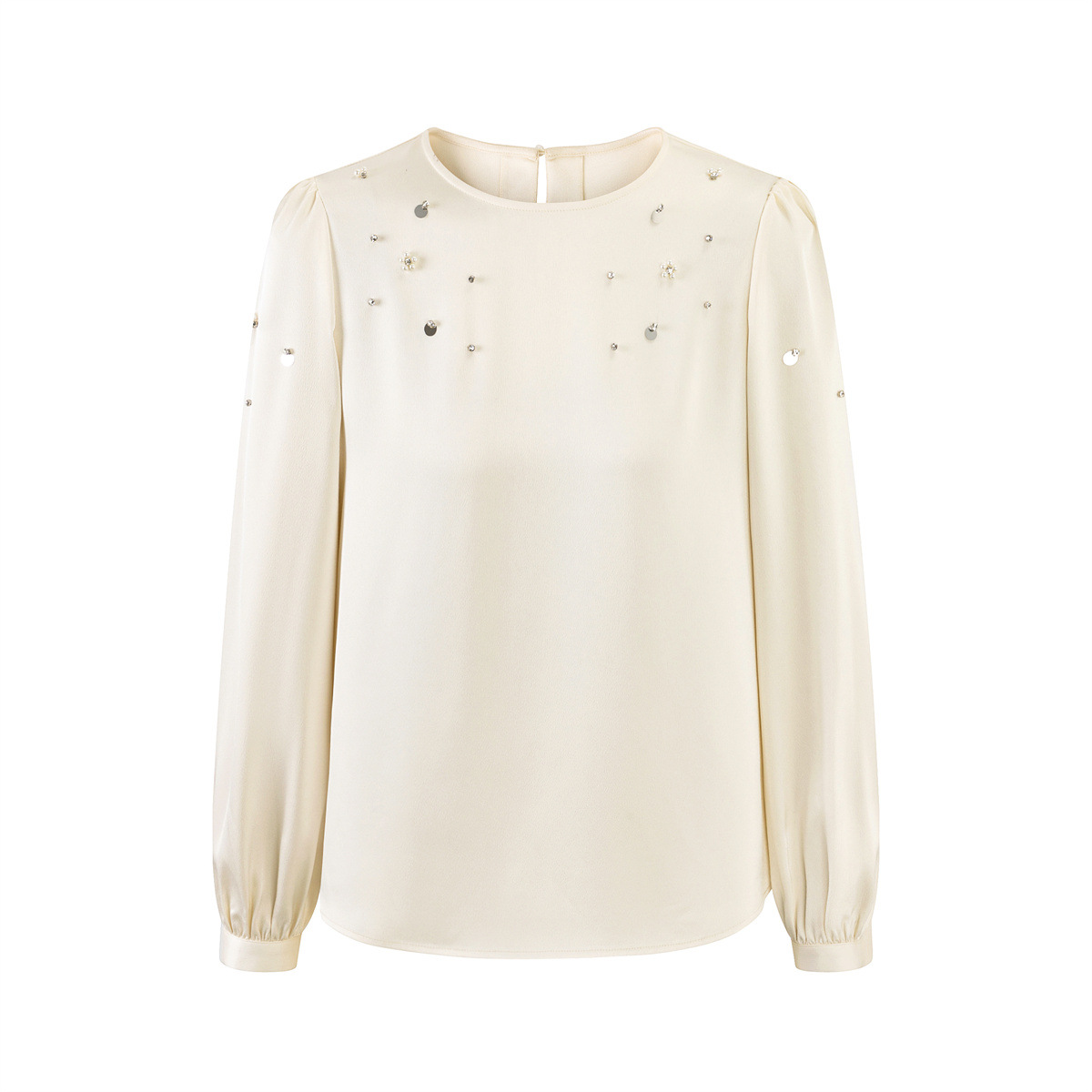 全新升级【铂金会员146/天猫199/差价53】(23349) 洛诗琳重工亮片钉珠衬衫2025春季新款气质圆领百搭雪纺上衣