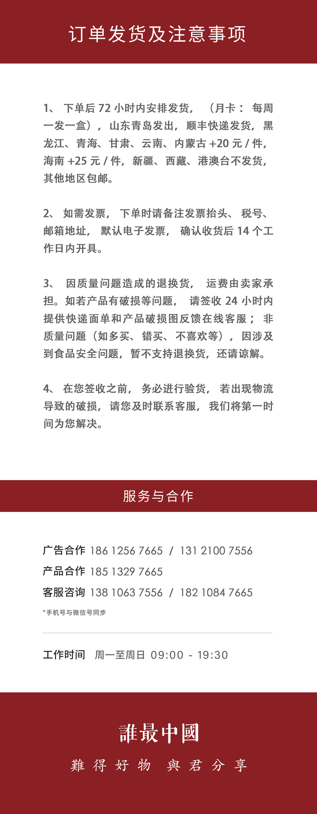 2.购买月卡的用户,每周一仓库会发货一盒哦,如若需更改时间需提前联系在线客服,谢谢