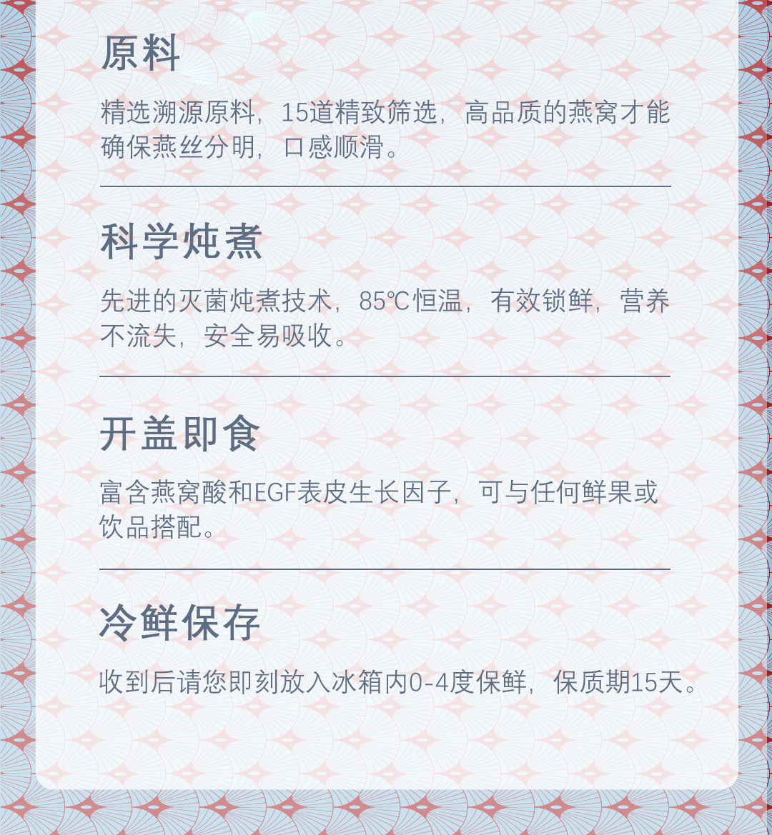 1.燕窝是当天现炖现发货的,因冷鲜产品,发货后不支持拦截,不支持更改地址,不支持退换货,还望知悉,请谅解。
