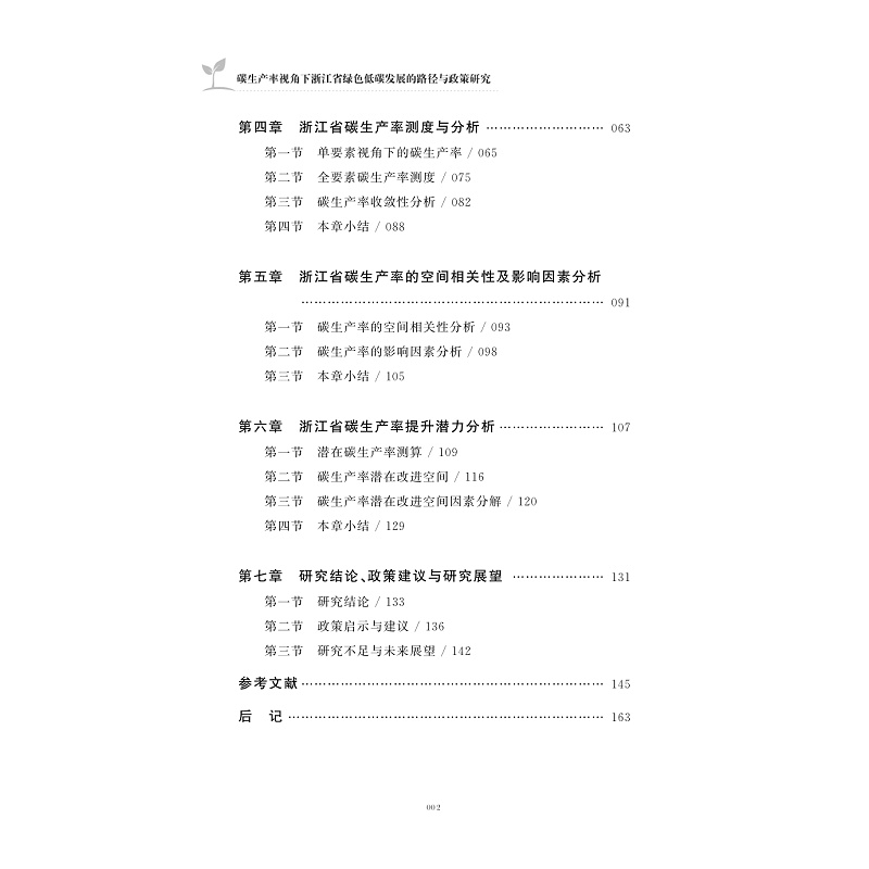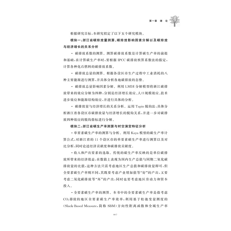 本书基于碳生产率视角,重点聚焦以下主要内容:一是碳排放量测算与分析,利用IPCC法测算碳排放量,利用LMDI法将碳排放量的影响因素进行分解,并对碳排放量峰值进行预测,利用Tapio模型分析经济发展与碳排放的脱钩指数。二是单要素碳生产率测度与分析,根据Kaya定义测算单要素碳生产率,分析演变态势、地区差异以及各地经济贡献度和碳排放贡献度,并对空间相关性及影响因素进行分析。三是全要素碳生产率测度,运用SBM—GML方法测算全要素碳生产率,分析收敛性。四是碳生产率提升潜力分析,测算潜在碳生产率和碳生产率潜在改进率,并实证分析碳生产率潜在改进率影响因素,并对影响因素分解为6种效应。五是浙江绿色低碳发展的路径与政策,将提升碳生产率作为实施绿色低碳发展的选择,并提出了相关建议。