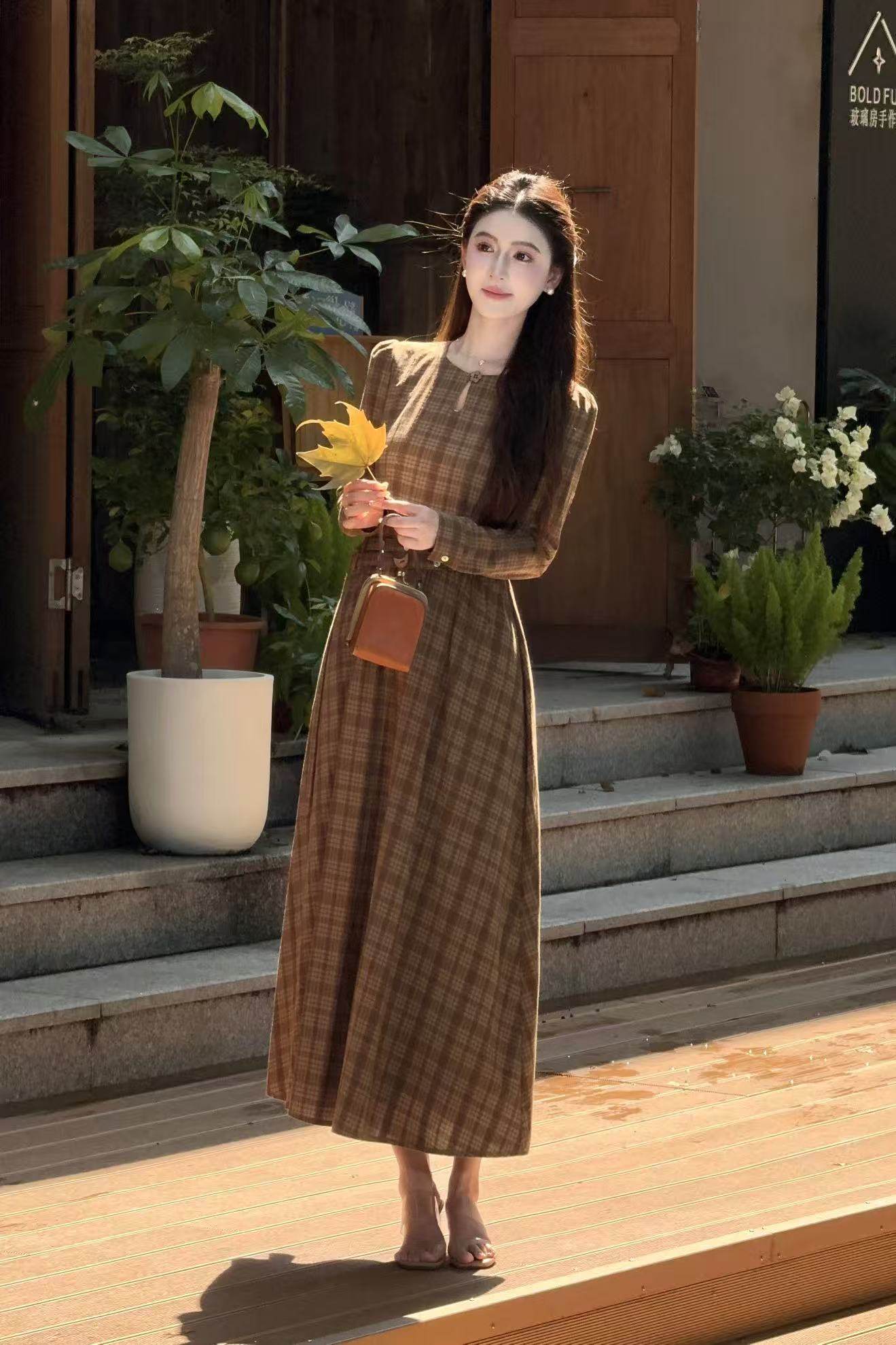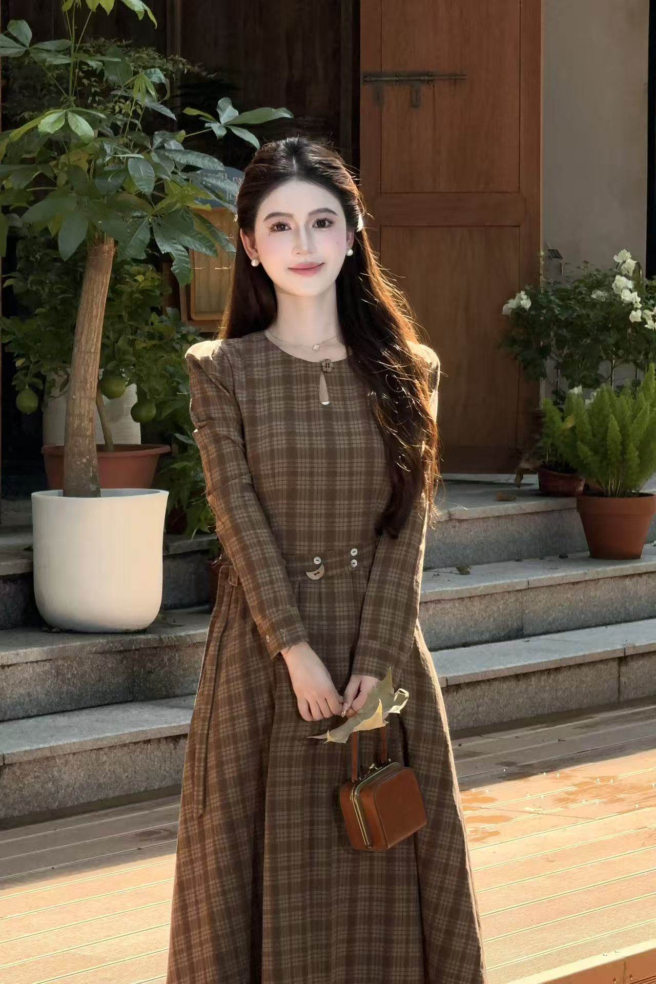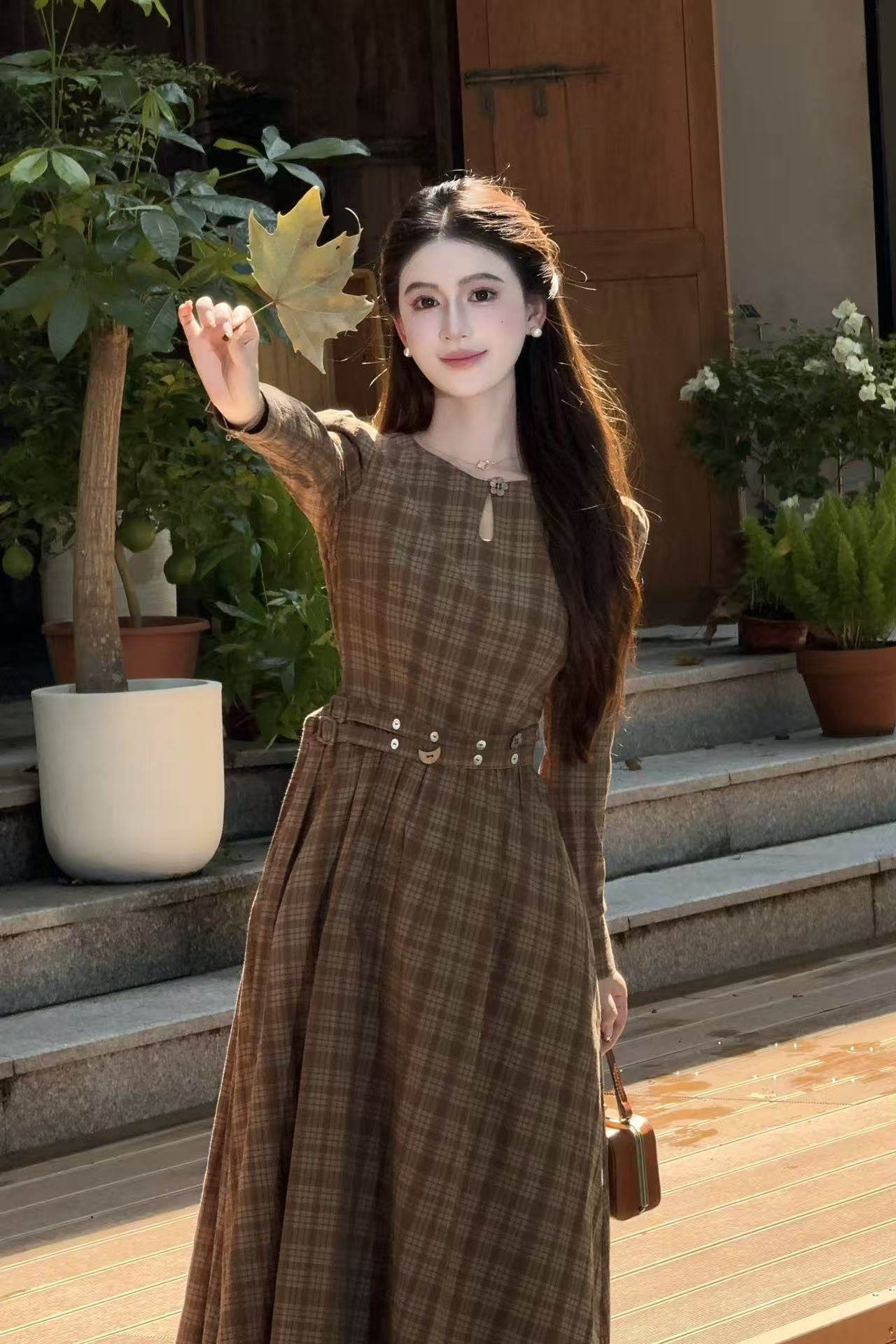 法式复古琥珀流光风棕色格纹腰带连衣裙子圆领