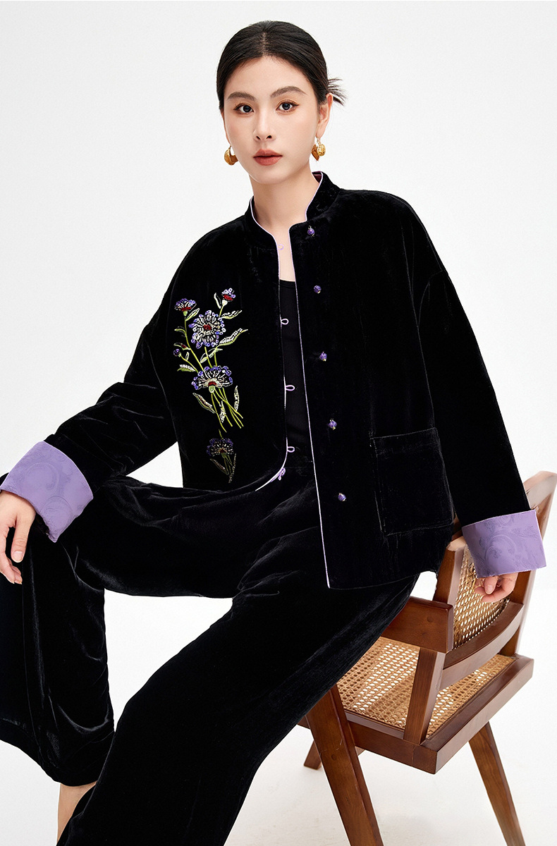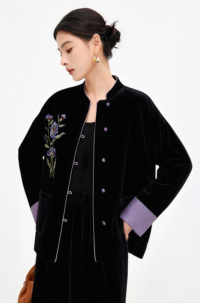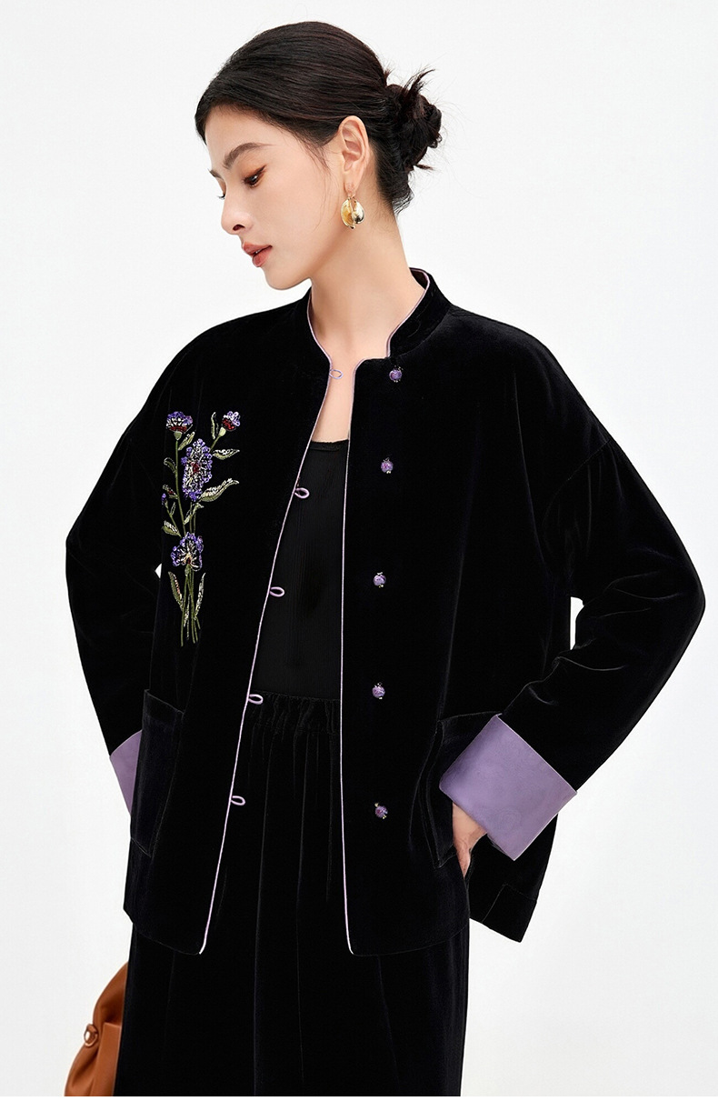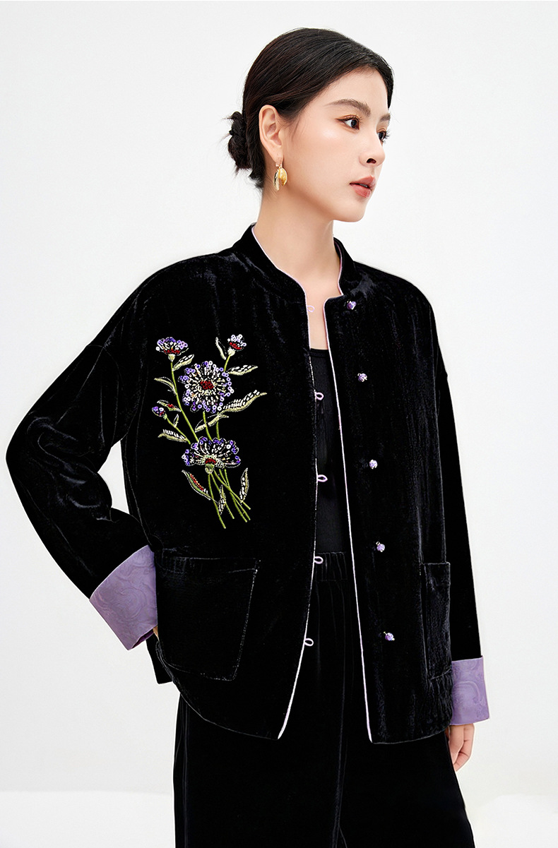 QS100%桑蚕丝底布中式真丝丝绒外套重工刺绣高级感上衣3863