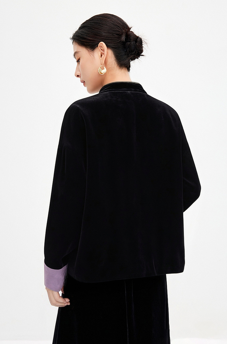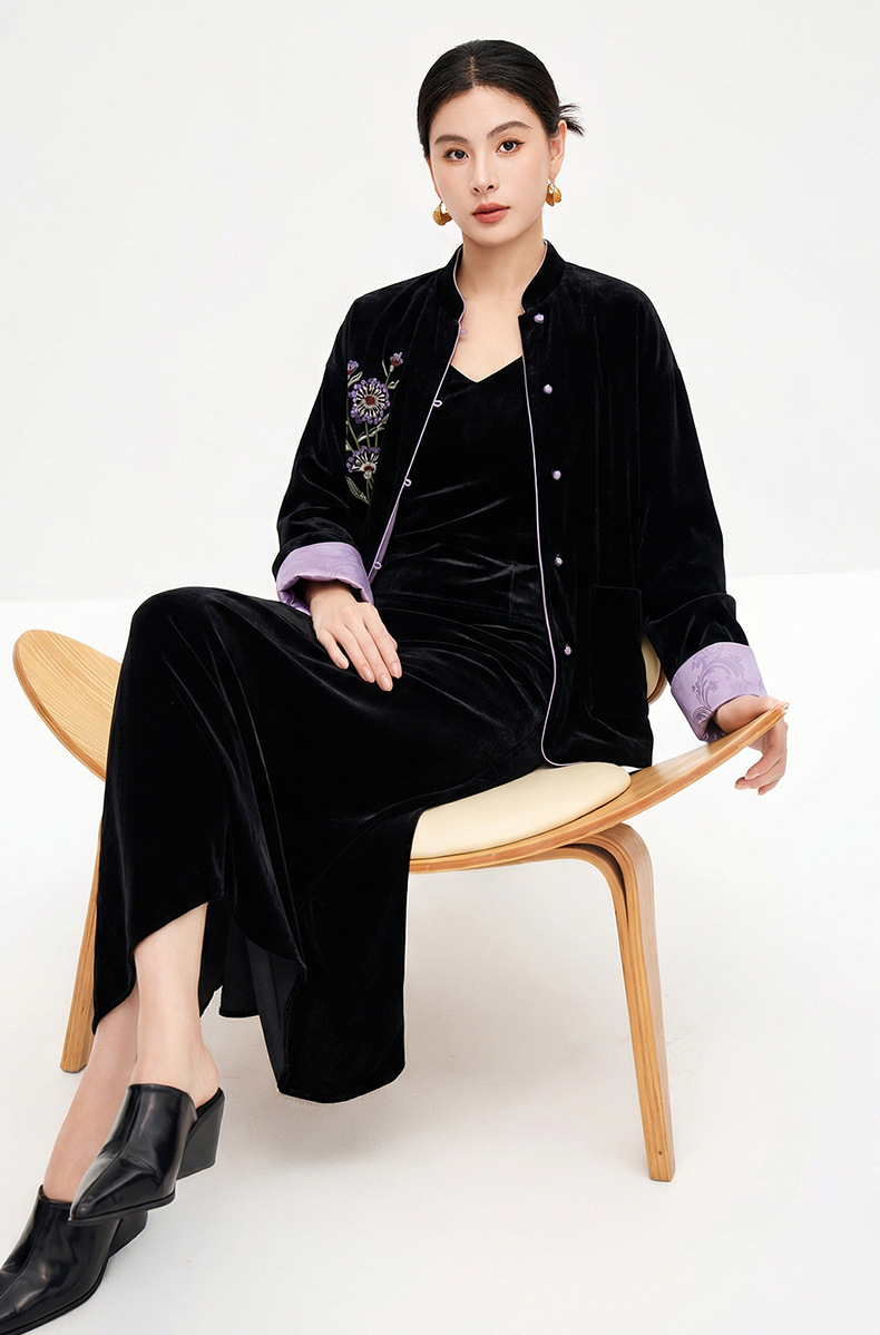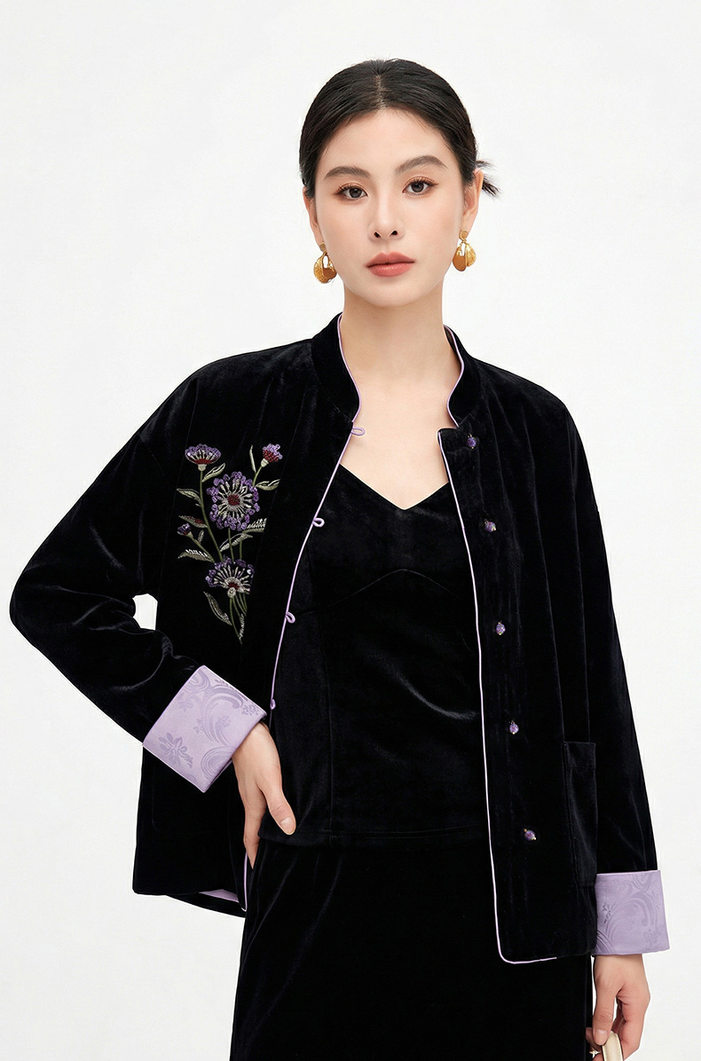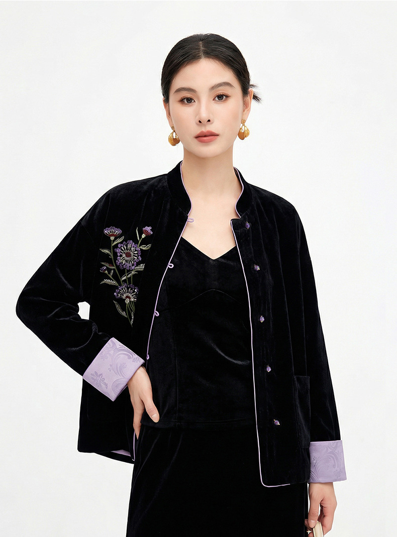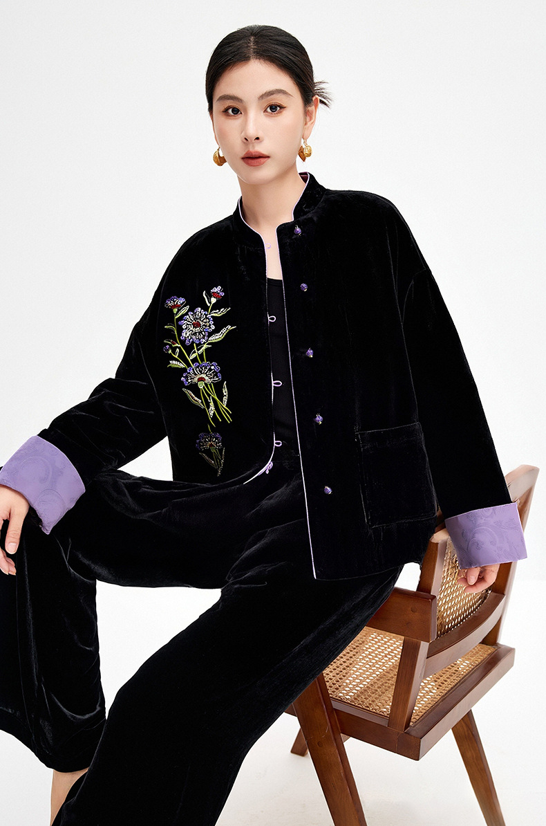 QS100%桑蚕丝底布中式真丝丝绒外套重工刺绣高级感上衣3863