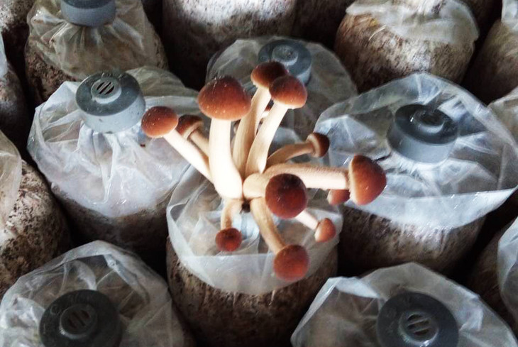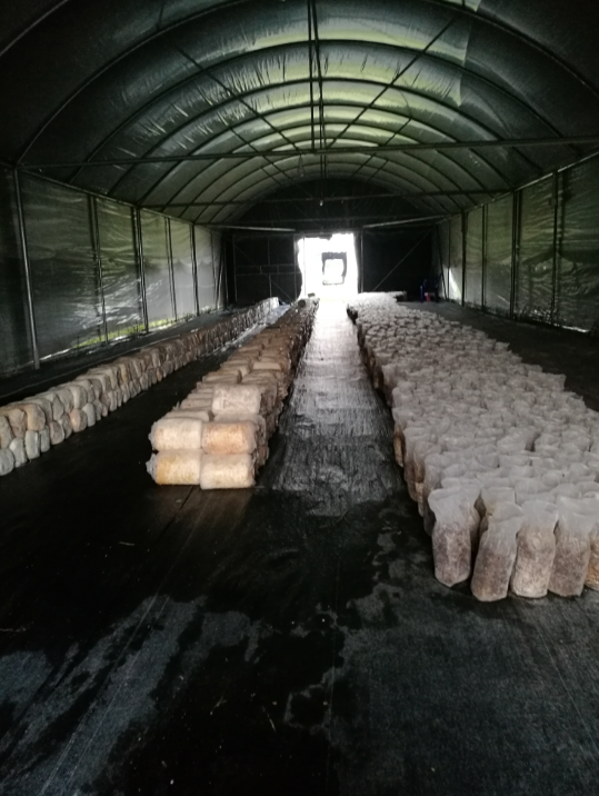 6.出菇管理:接种后的菌包发送到绿手指农园内的蘑菇棚,平菇子实体在这里成长。由于没有使用催生素,绿手指平菇产量更少,产期更长。