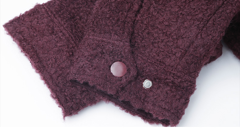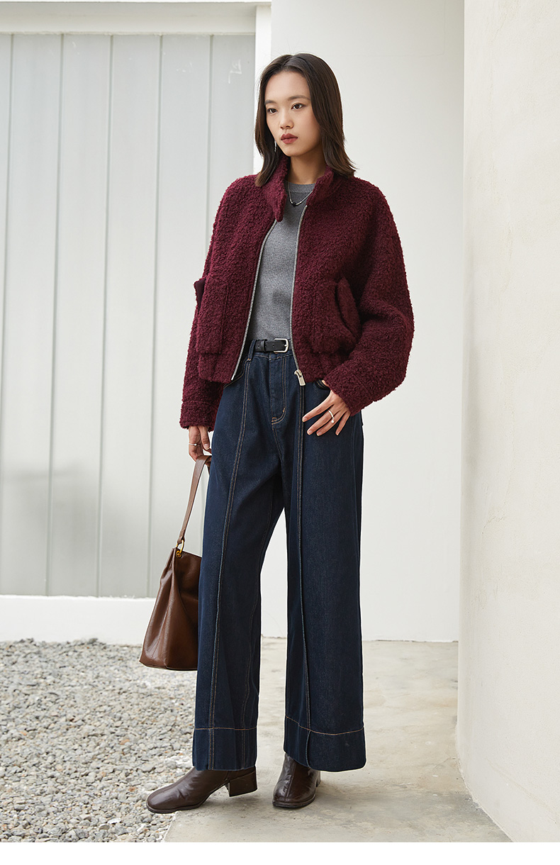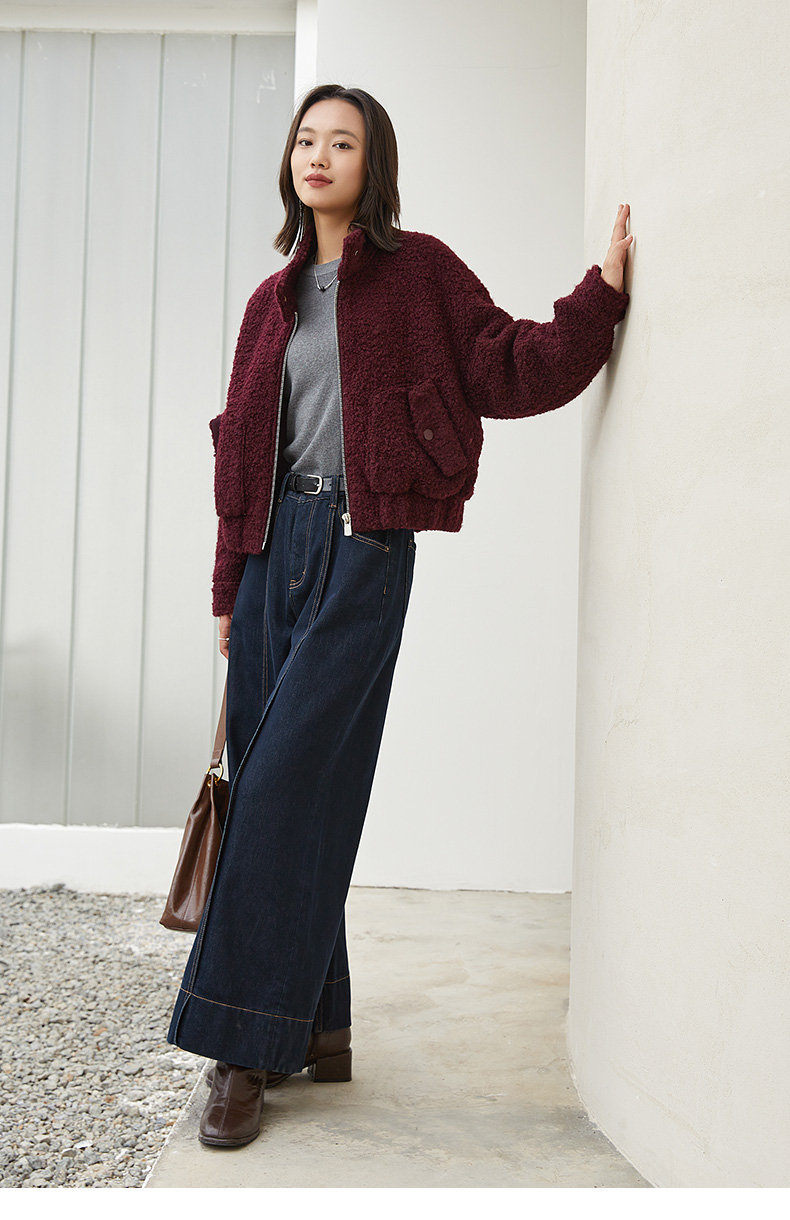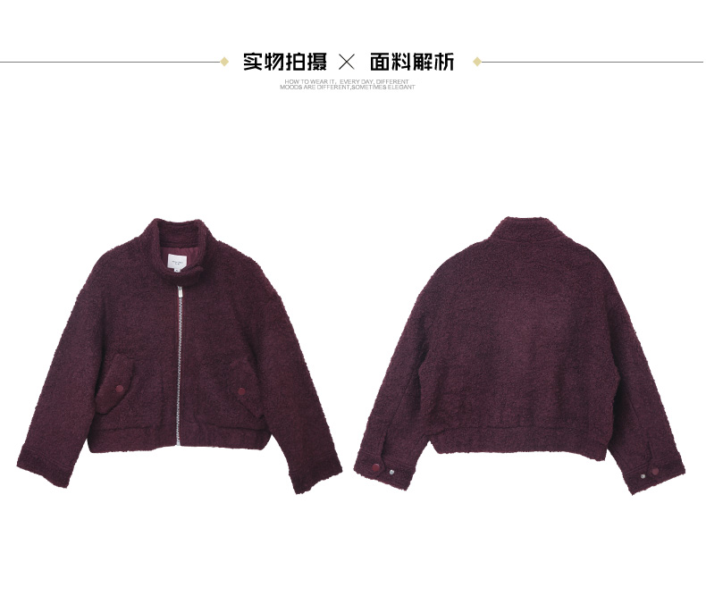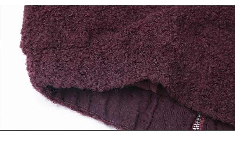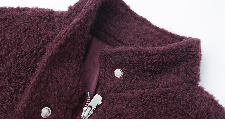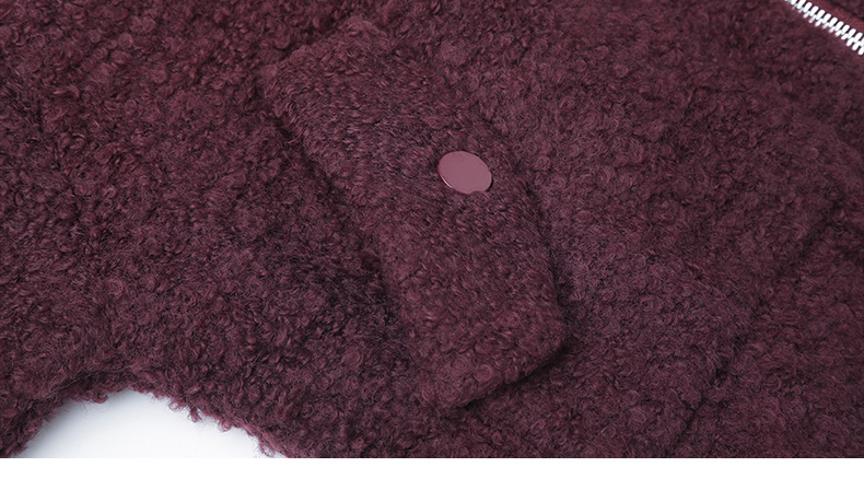 酒红色立领拉链羊羔毛外套 短款宽松毛绒夹克 口袋纽扣装饰秋冬保暖上衣