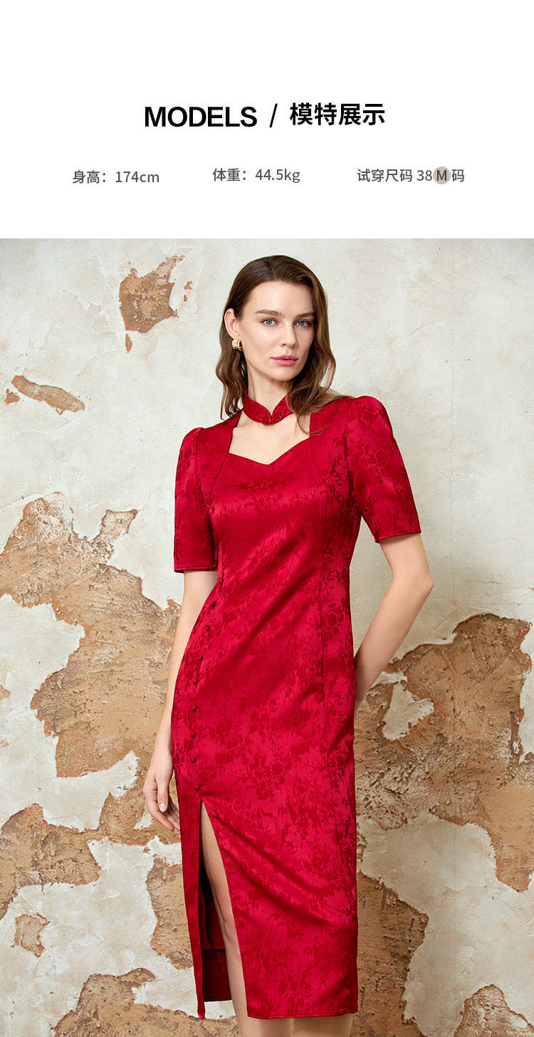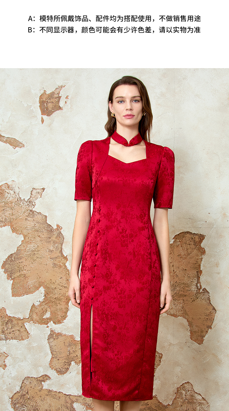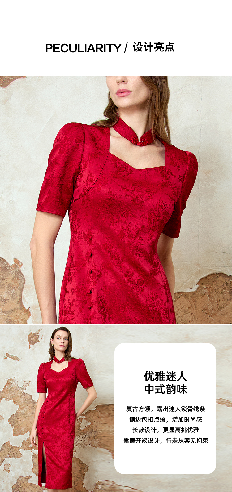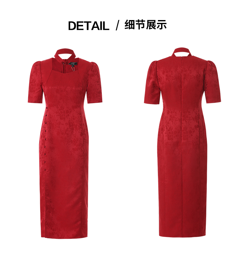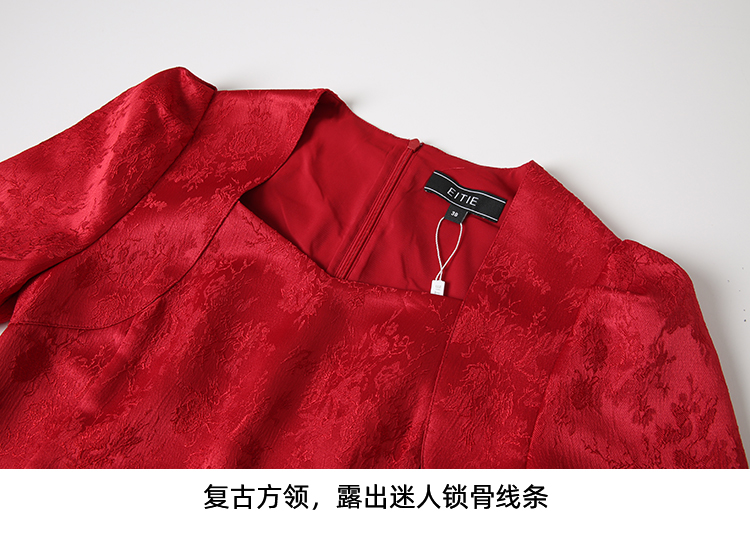 EITIE爱特爱挂脖方领复古开叉暗纹新中式旗袍连衣裙2025春季新款8177802