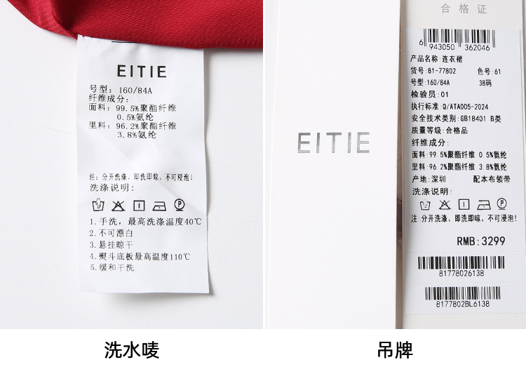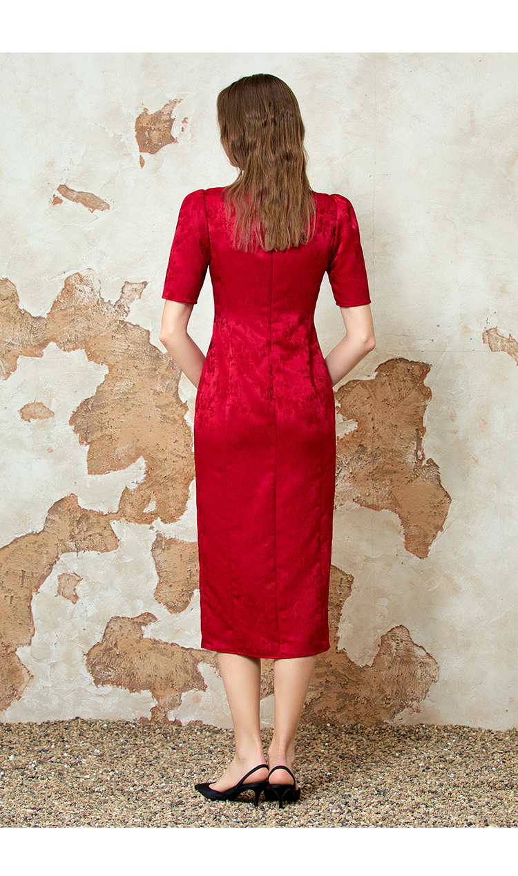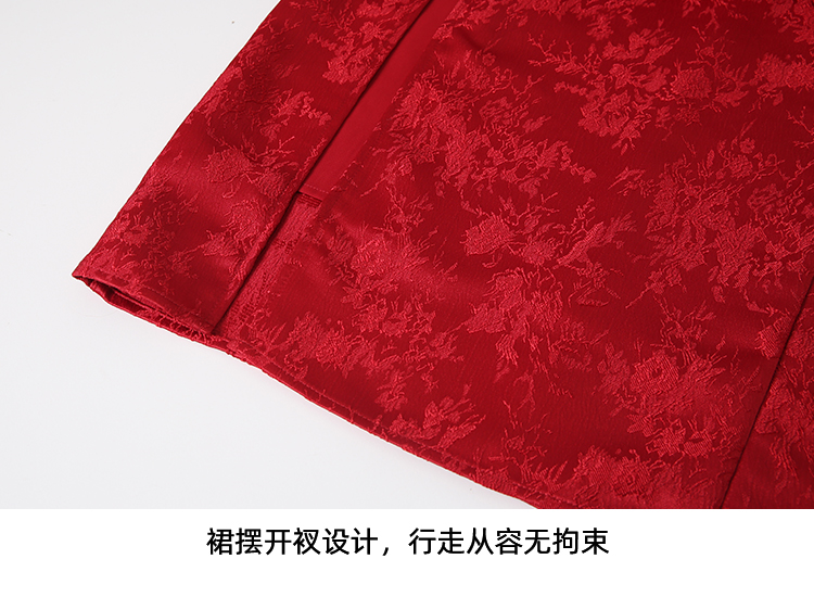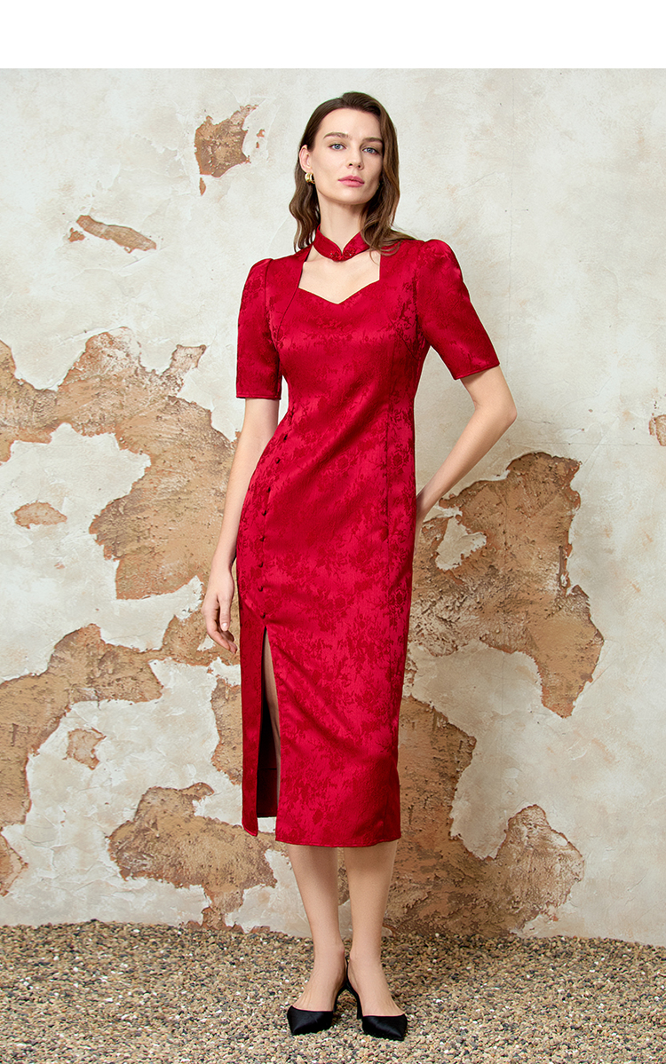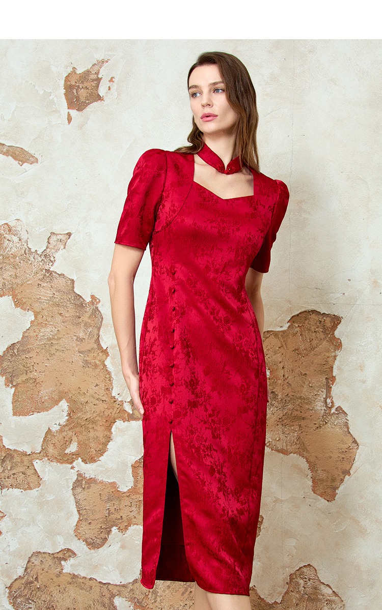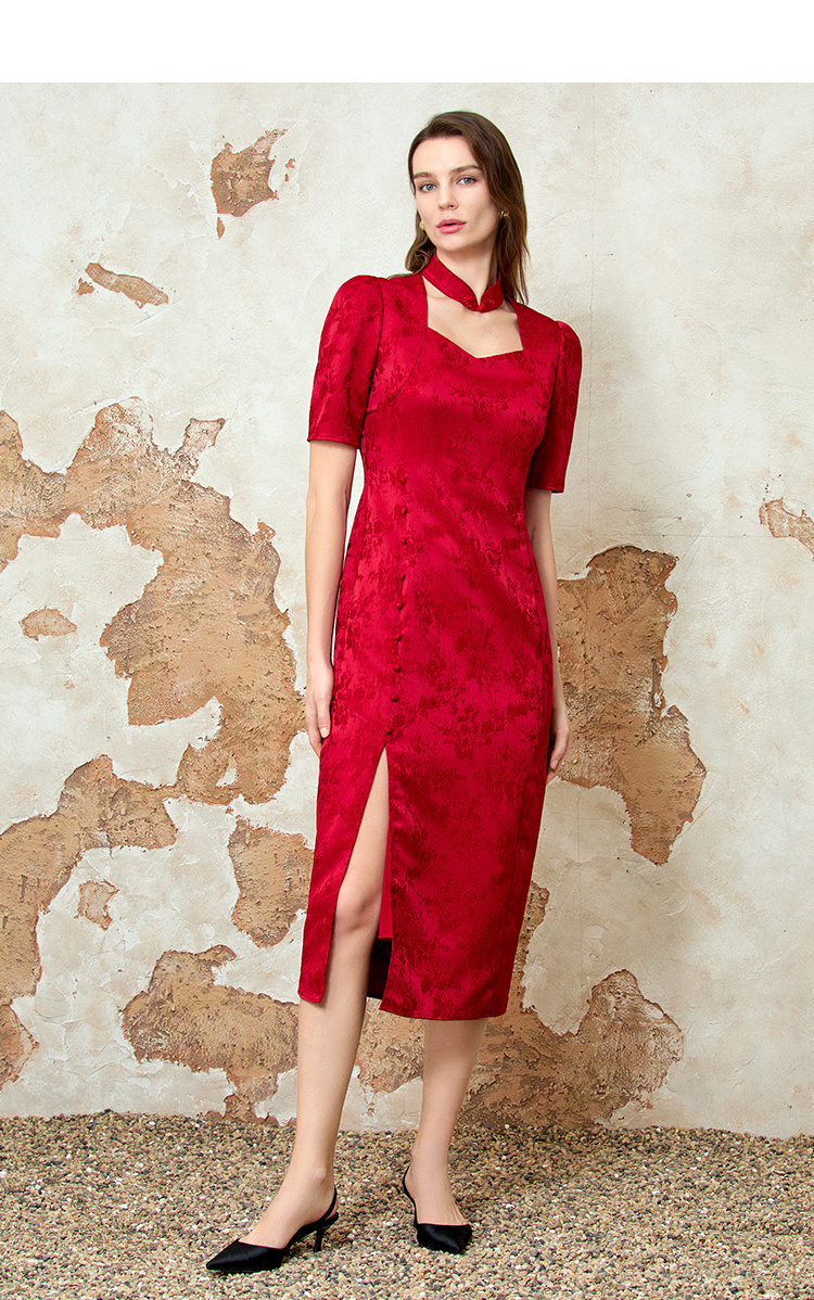 EITIE爱特爱挂脖方领复古开叉暗纹新中式旗袍连衣裙2025春季新款8177802