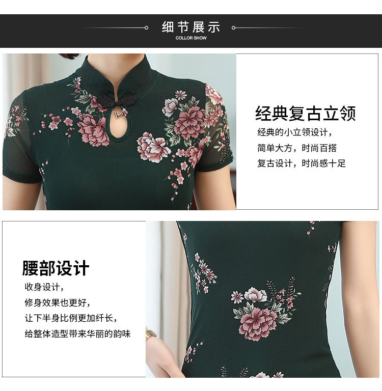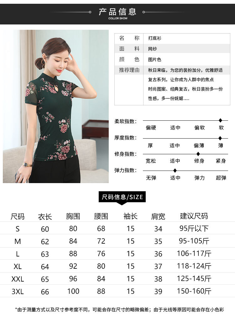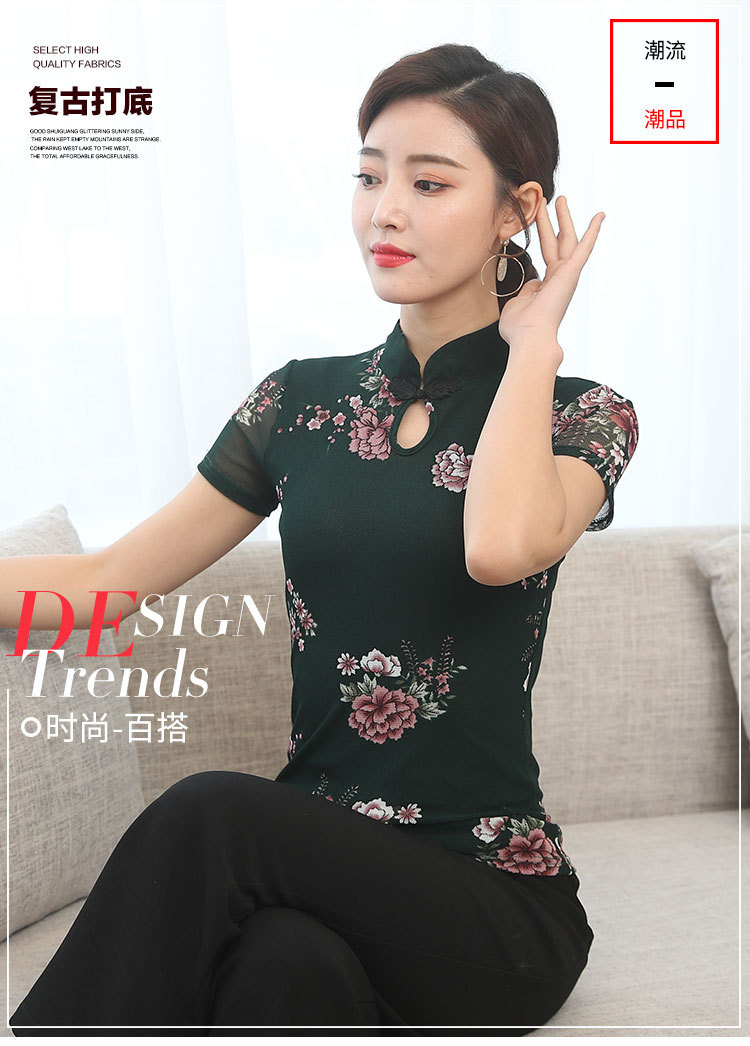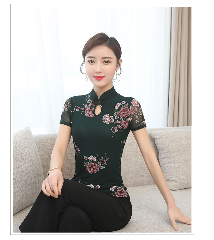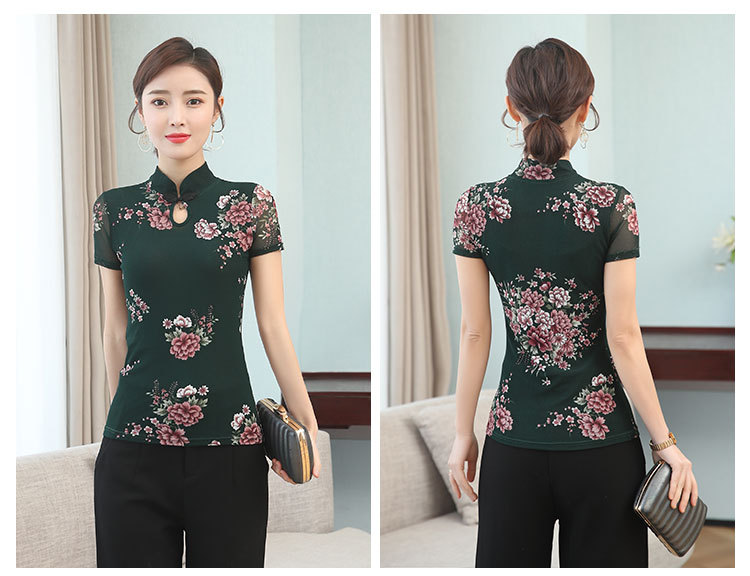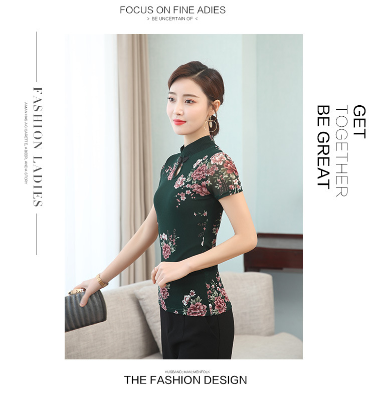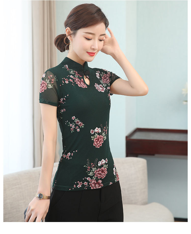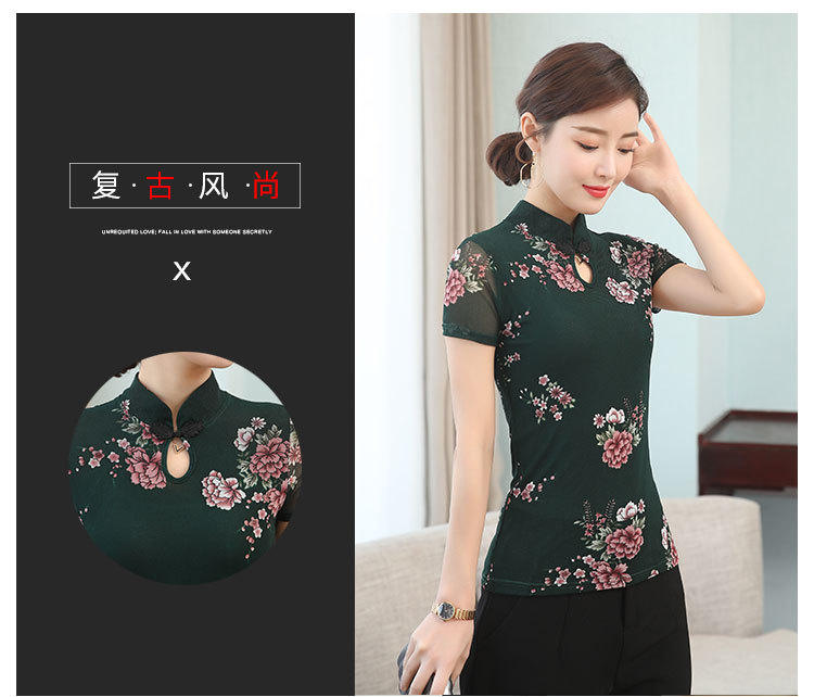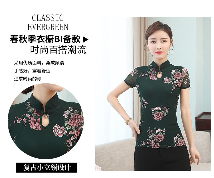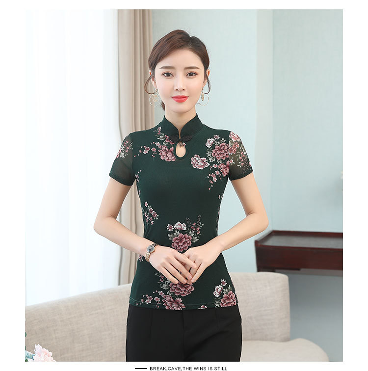 JL-571新款民族风立领 盘扣网纱蕾丝印花短袖女T恤