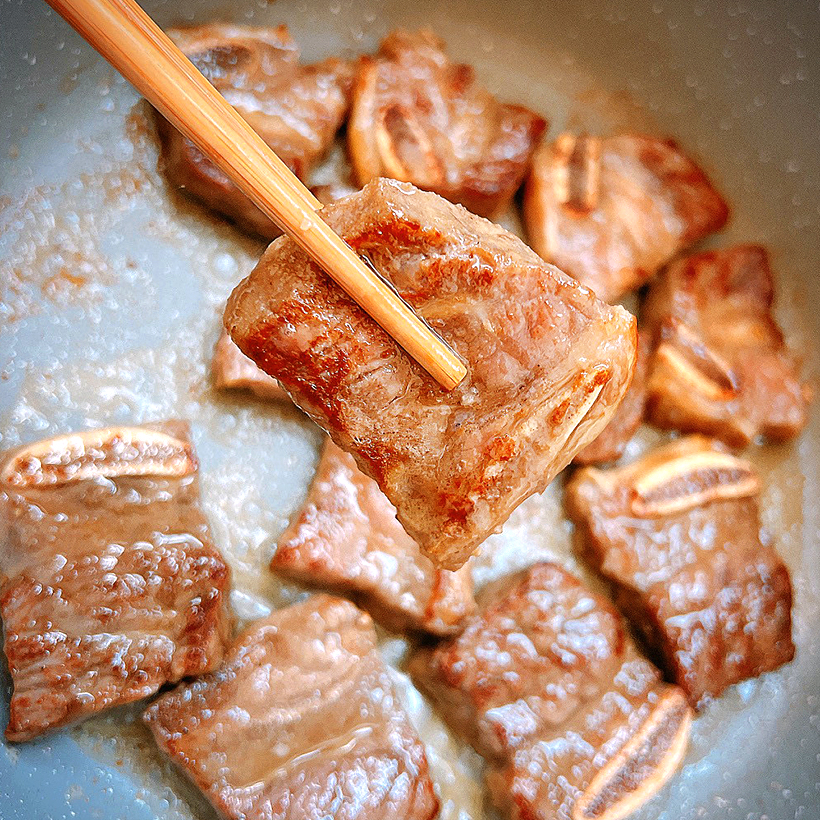 这样的牛仔骨在入锅煎制的过程中,油份会均匀渗入到瘦肉中,吃起来才会不肥不腻、不干不柴,而又鲜嫩可口。