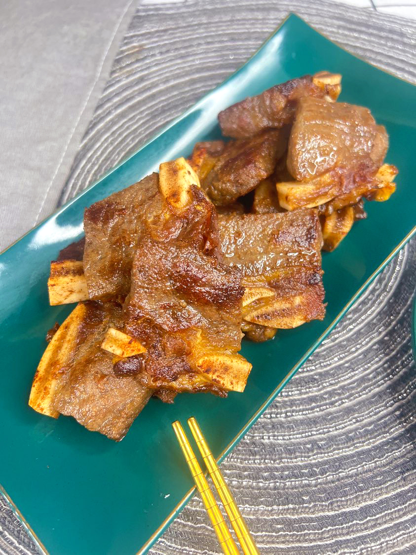 取自牛腹部的肋骨,整块切割,连骨带肉,脂肪分布均匀,肉质细嫩。