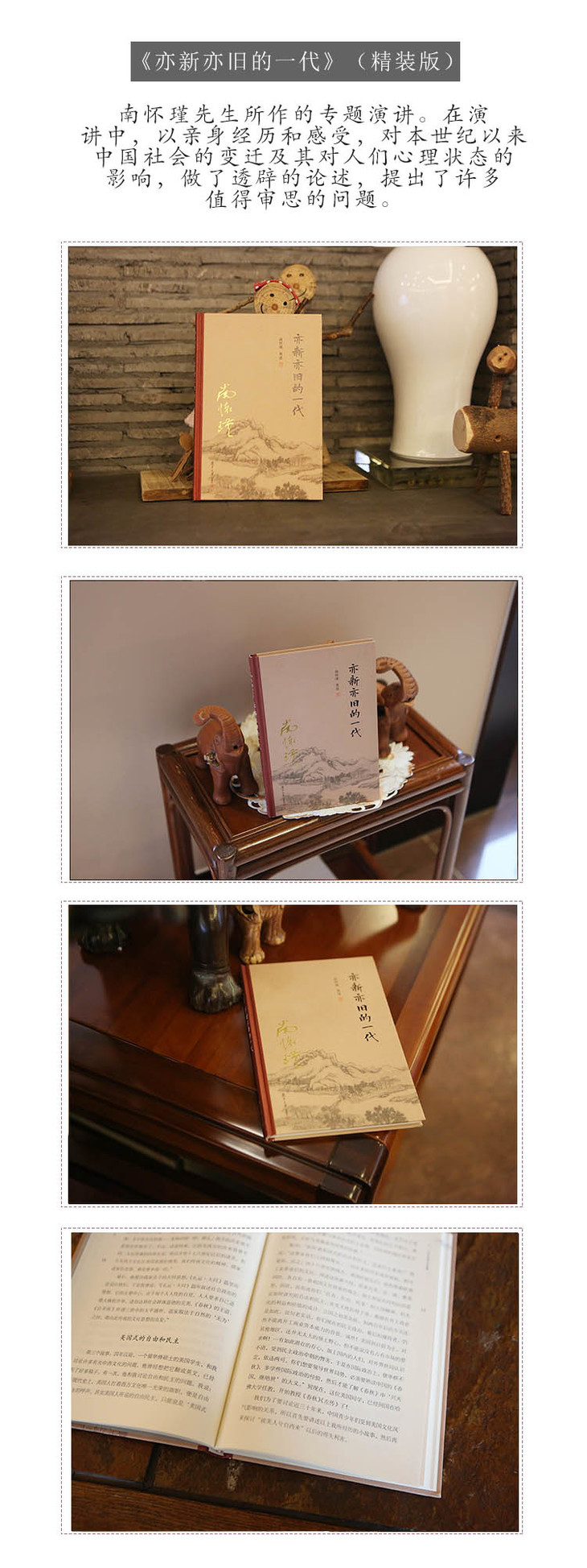 《亦新亦旧的一代》是南怀瑾老师所作的专题演讲。在演讲中,作者以自己的亲身经历和感受,对本世纪以来中国社会的变迁及其对人们心理状态的影响,做了透辟的论述,提出了许多值得审思的问题。内容叙及:清末民初的社会思潮,重大的政治事变,中西文化的冲撞,学术思想的演变,古代的文化教育制度,现代的道德价值观念,老少之间的代沟,新旧不同的读书,旧八股与新八股,私塾与家教,尊师重道,安身立命,以及青少年的个性、学识、心理、经验、行为,等等。言语委婉,知识丰富。