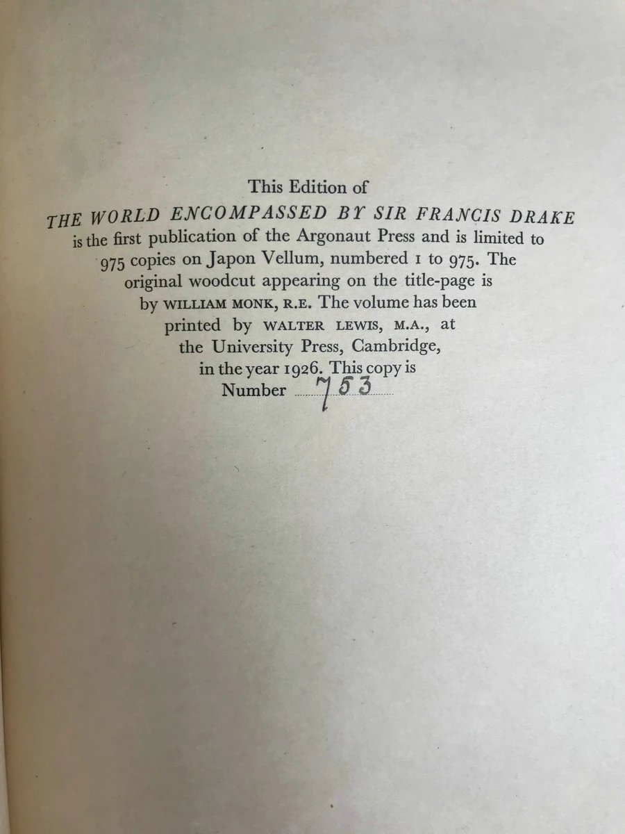 限量版毛边本!有编号!1926年 弗朗西斯·德雷克船长航海记 配插图与地图 漆布精装16开