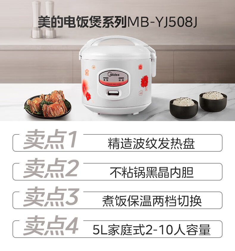 美的(Midea)5L 电饭煲 机械式 不粘内胆 白色印花 可拆洗接水盒 简单耐用电饭锅MB-YJ508J
