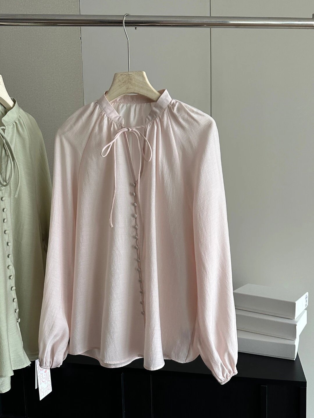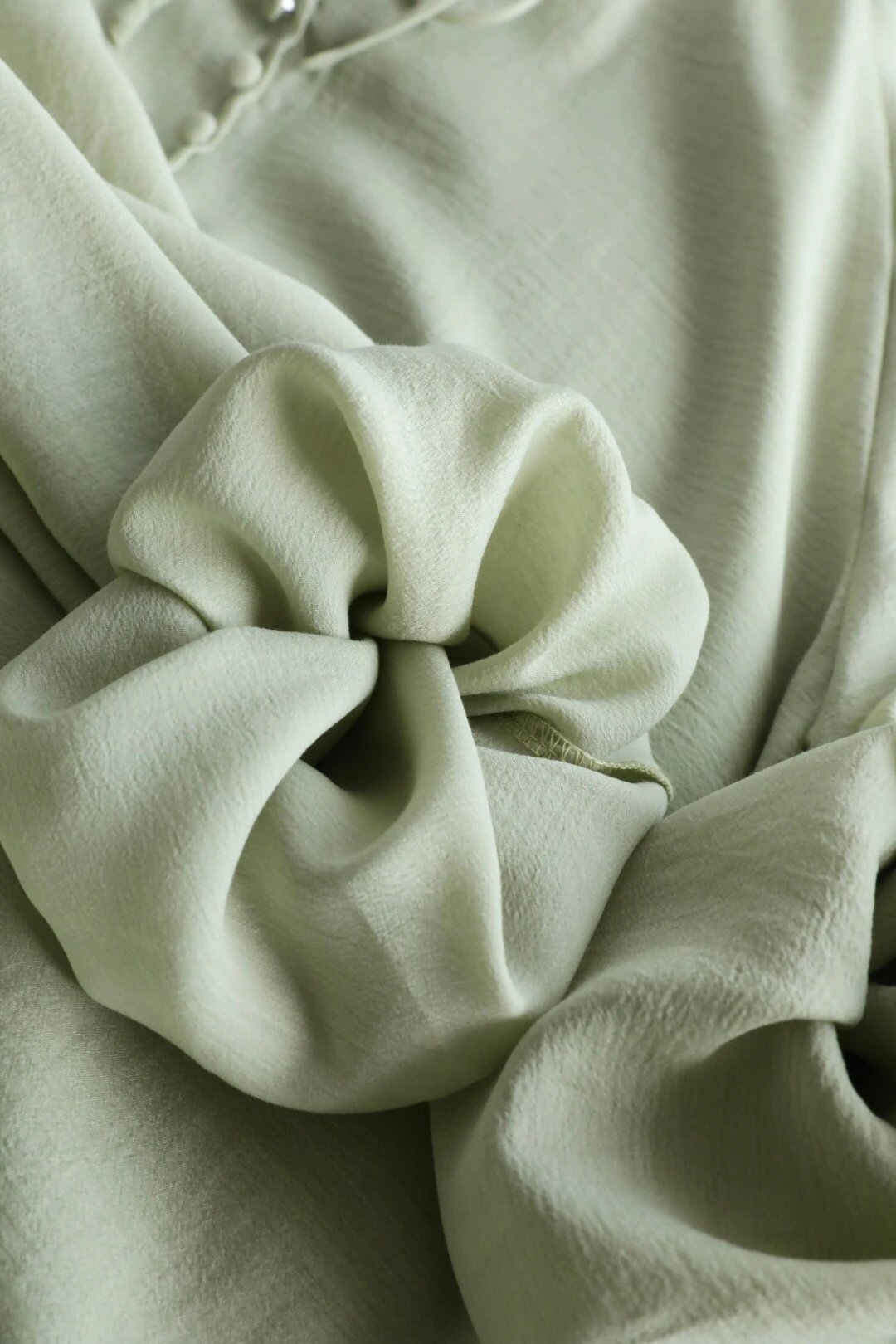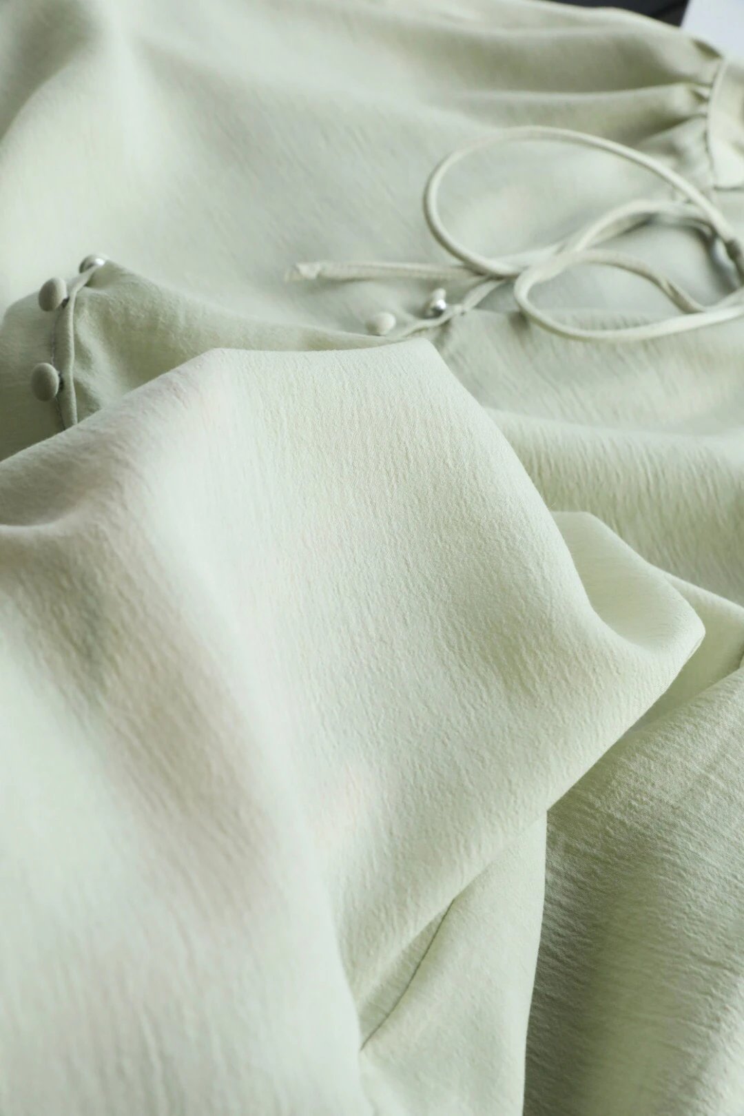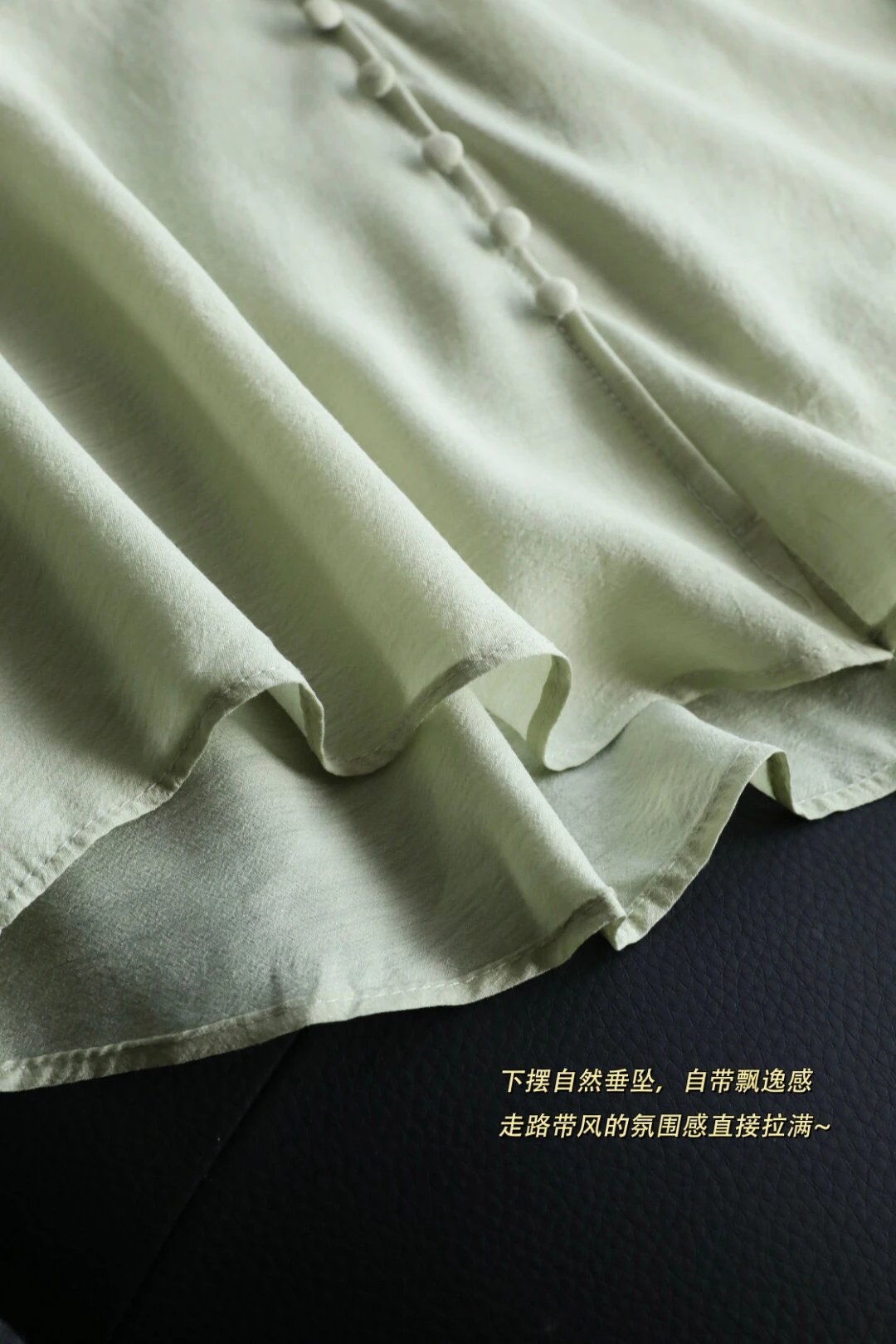 门襟的装饰包扣平添了古朴的手工气息,也是设计感所在,领口的缩皱设计,平添了整体的飘逸丰盈量感,轻松制造出人在衣中晃的清瘦感~