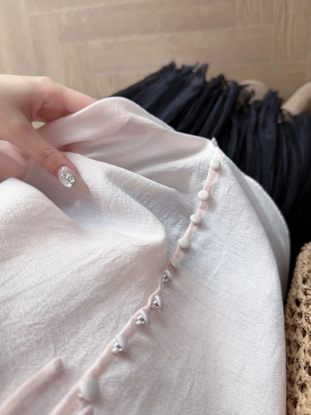 微透面料的肌理好美好美!!!穿上后与肤色之间若隐若的那种感觉,有几分让人惊艳的魅力!