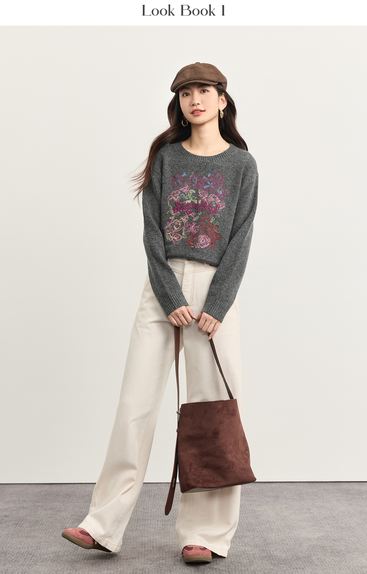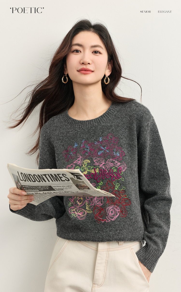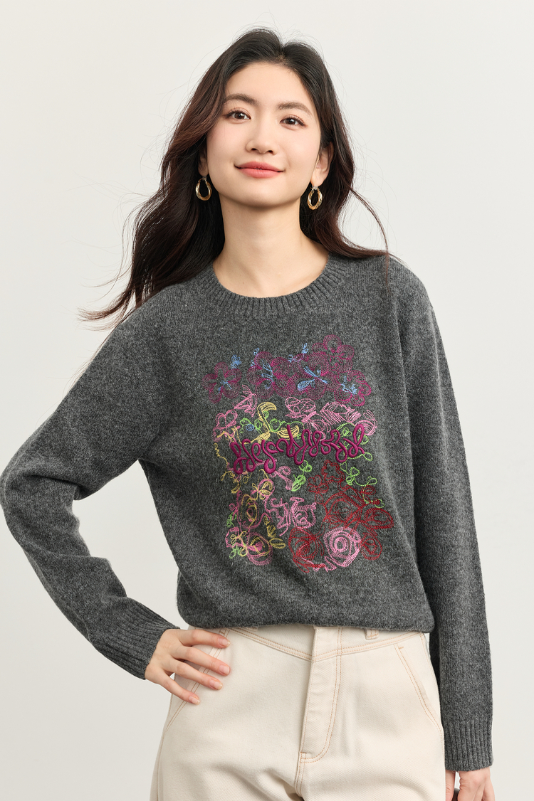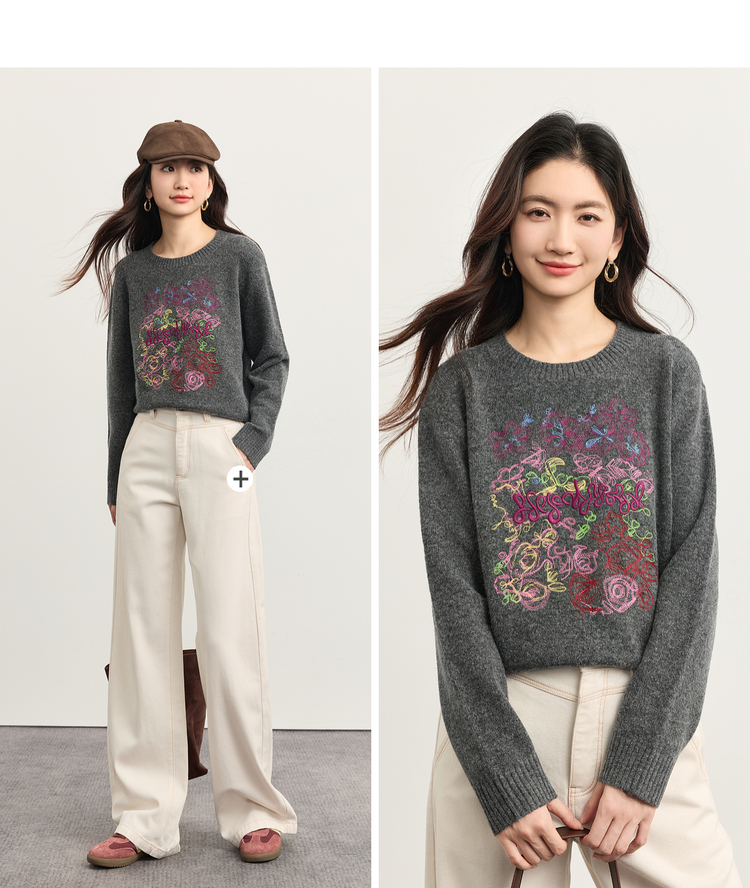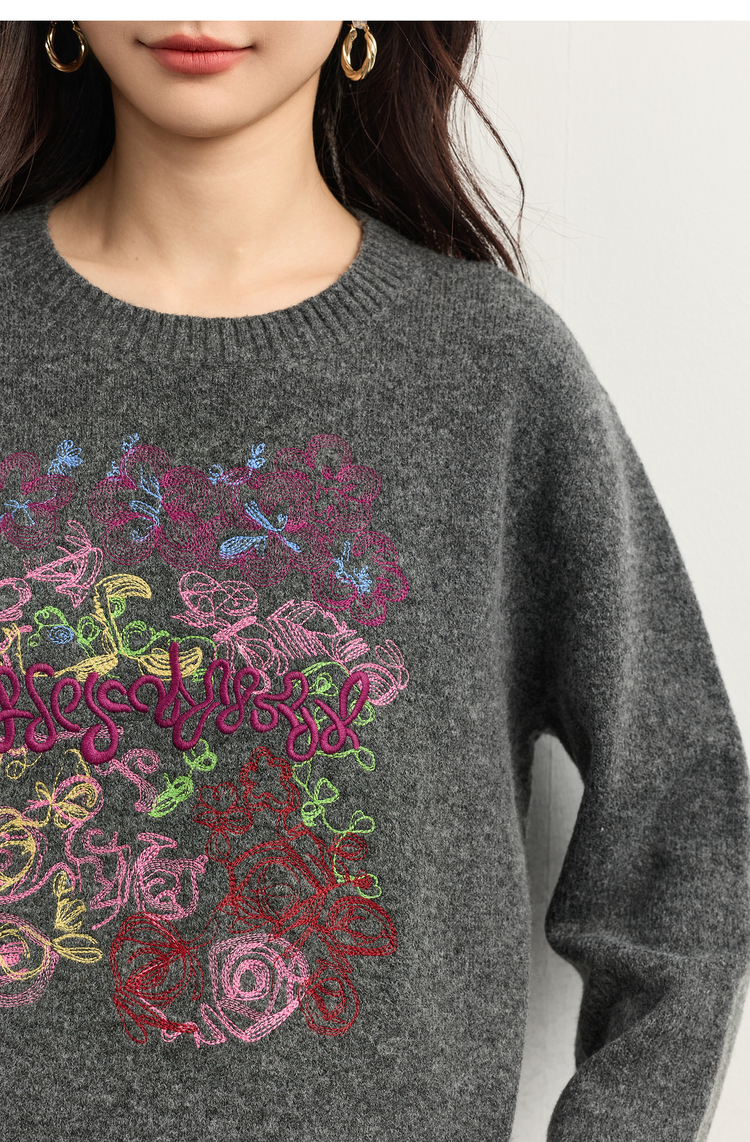 【周末秒杀】熙世界【多巴胺彩绣毛衣】羊毛圆领长袖套头针织衫女2025冬季新款