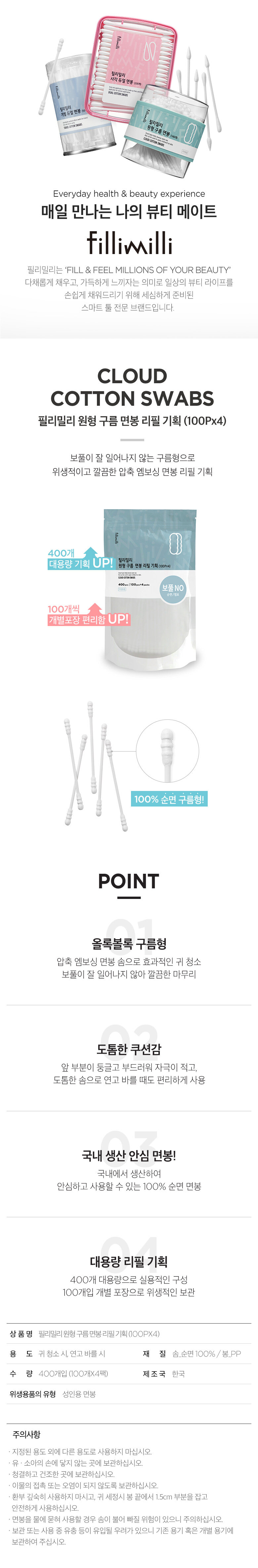 韩国fillimilli纯棉耳朵棉签棉棒补充装(100P * 4)Olive YoungJPY带授权招加盟代理