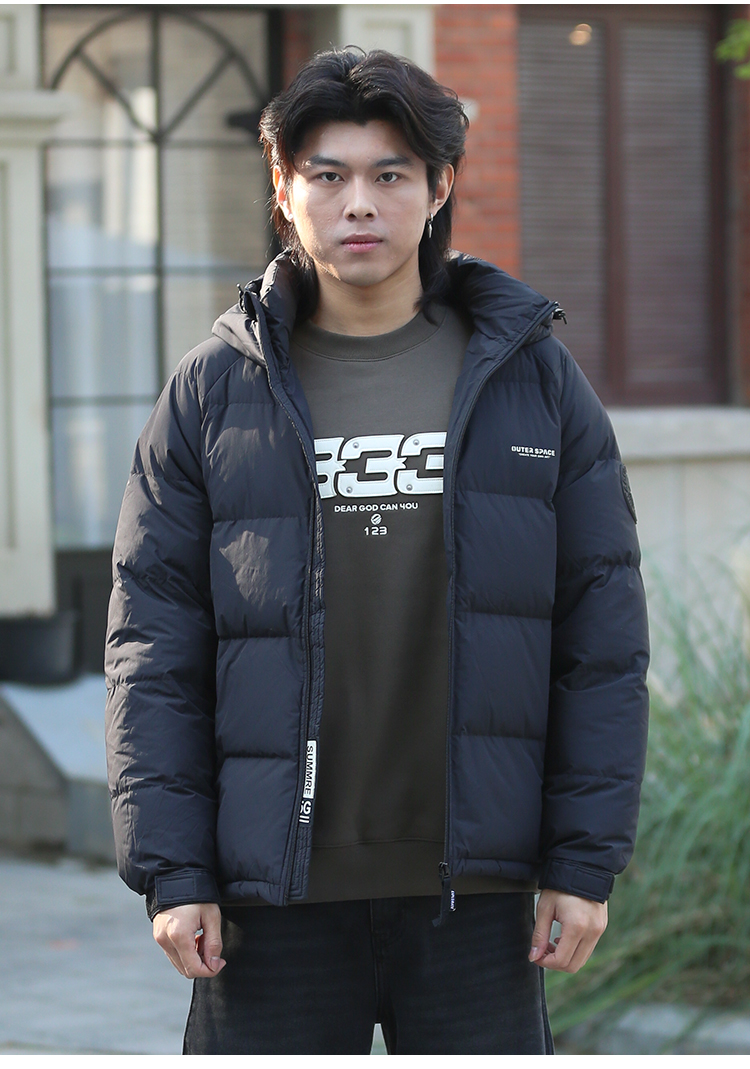 DRONKOO 2024 90%绒 连帽左胸字母左袖圆标下摆抽绳基础短款中厚羽绒服