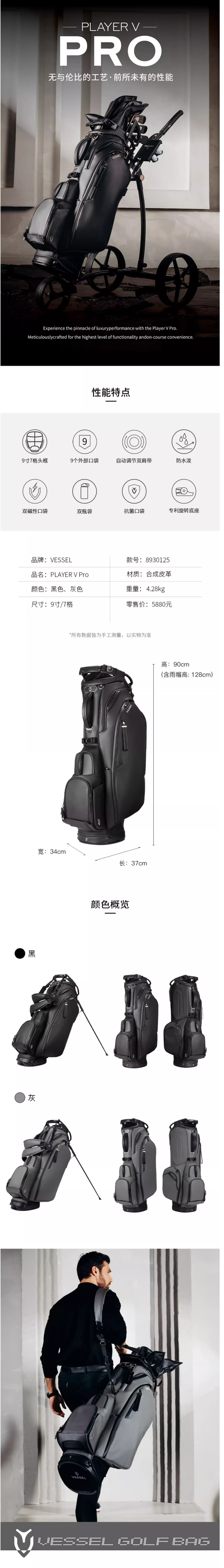 VESSEL PlayerVPro 2025年高尔夫球包PlayerVPro支架包男女7格9寸可搭配铁杆架8930125