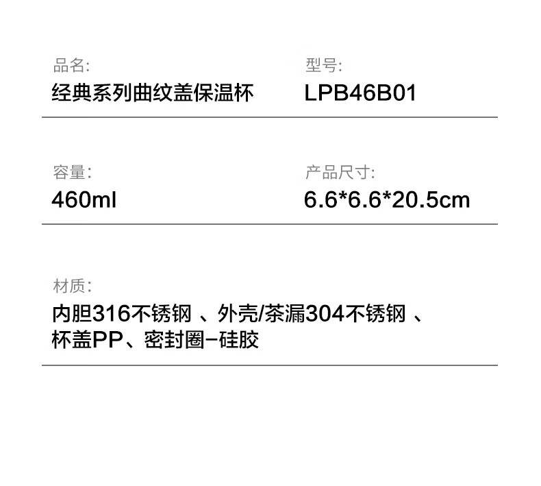 【分仓直发包邮】康巴赫经典系列曲纹盖保温杯LPB46B01