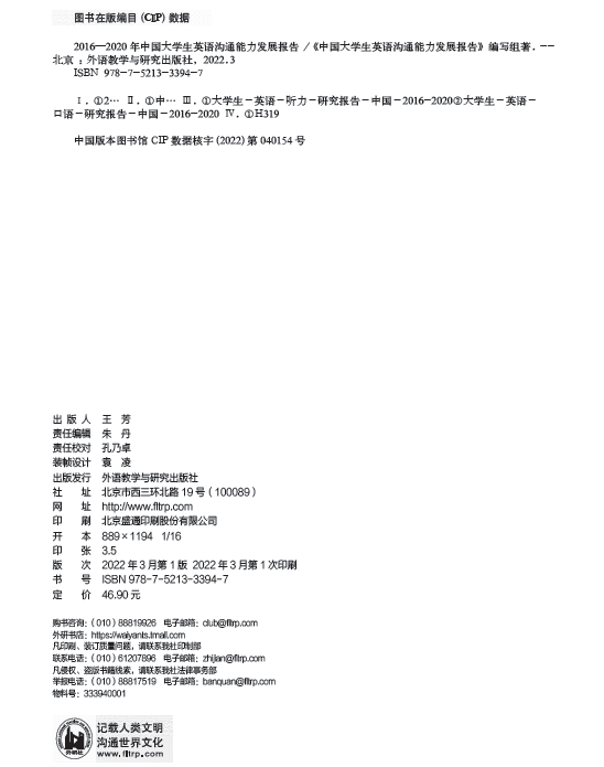 《2016—2020年中国大学生英语沟通能力发展报告》展现了中国大学生英语沟通能力现状及其发展趋势,为革新教学理念、提升教学能力、开展以培养英语沟通能力为导向的教学与测试研究提供了启示与借鉴,为企事业单位了解大学生英语沟通能力的发展状况提供了支撑,让育人有目标、选人有方法、用人尽其才!