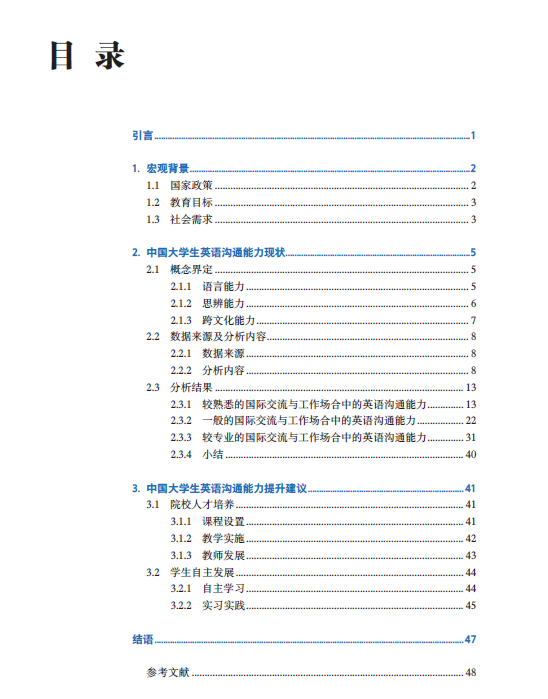 本报告除引言、结语外,主要包含三个章节:宏观背景、中国大学生英语沟通能力现状和中国大学生英语沟通能力提升建议。