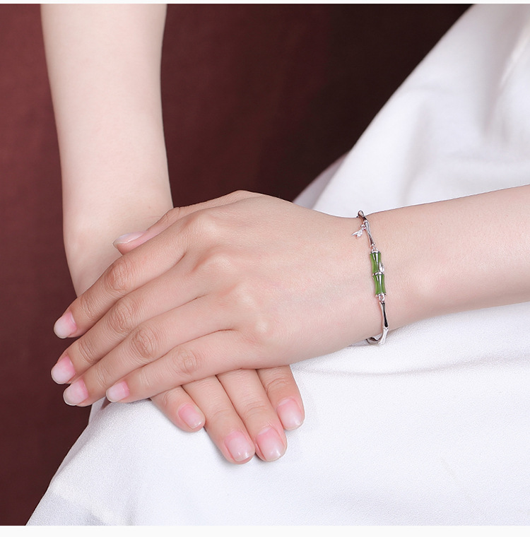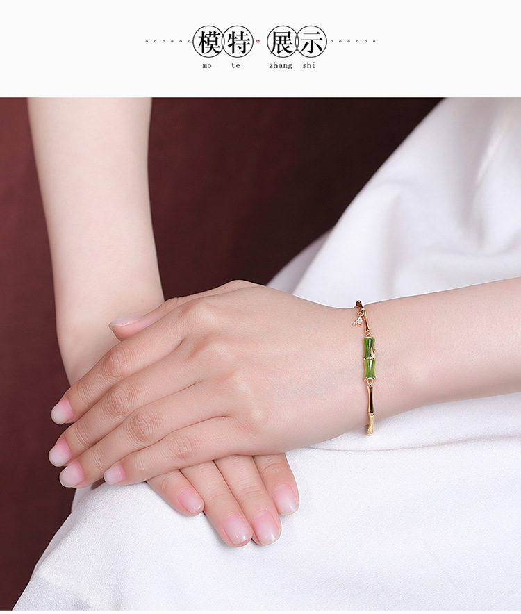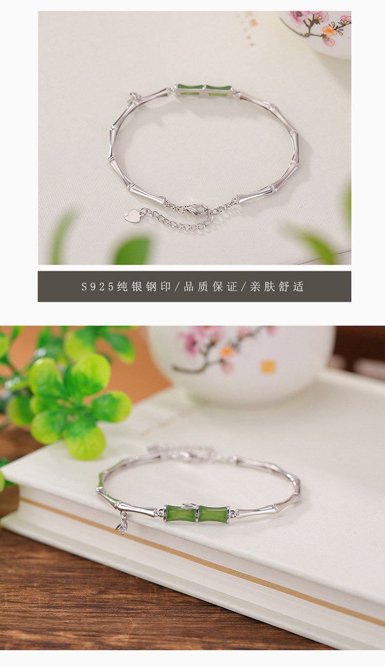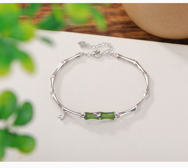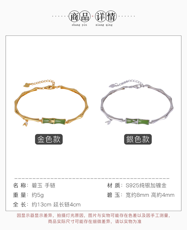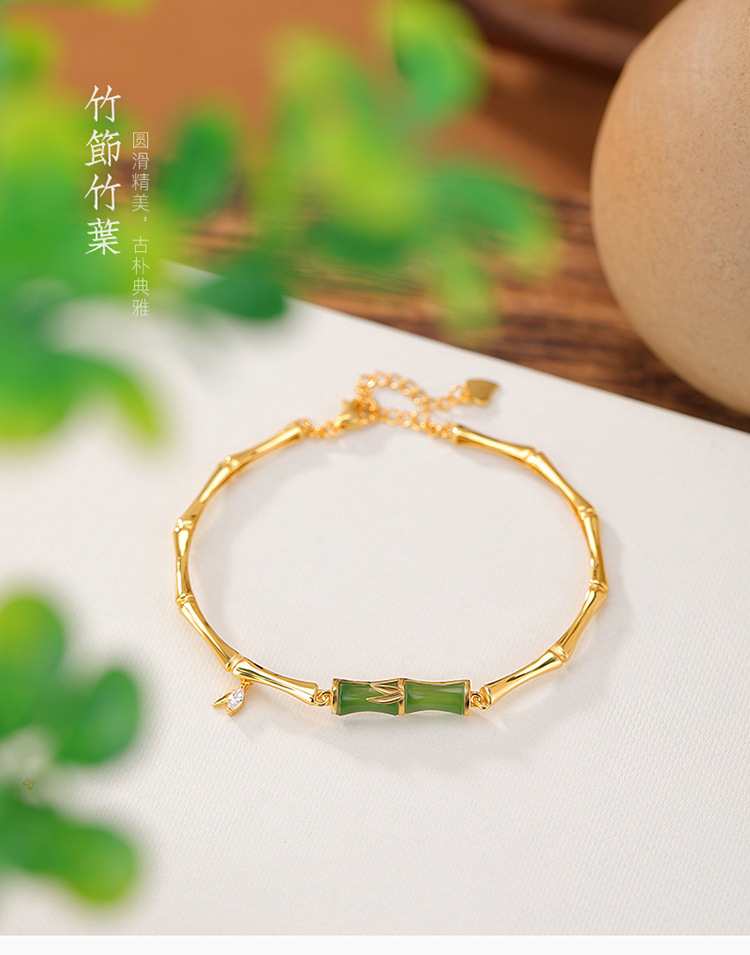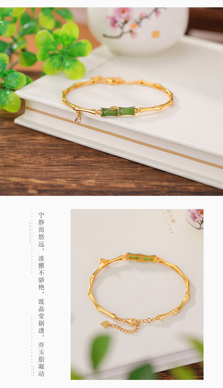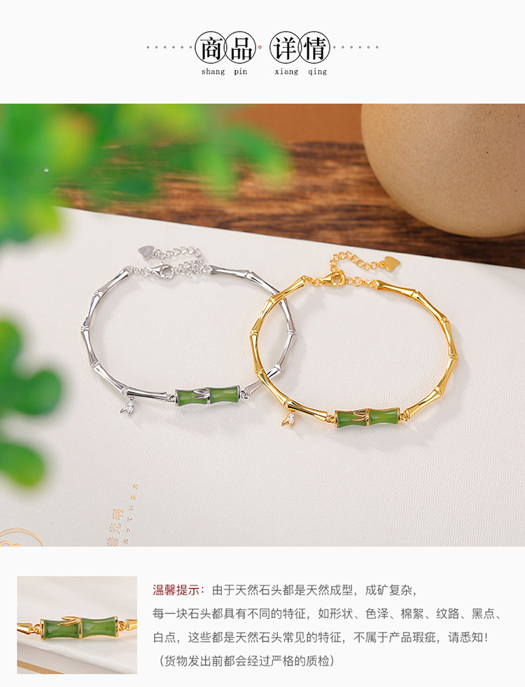 【节节高升】S925纯银镀金和田玉碧玉竹节竹叶手链【CW-SL11777】