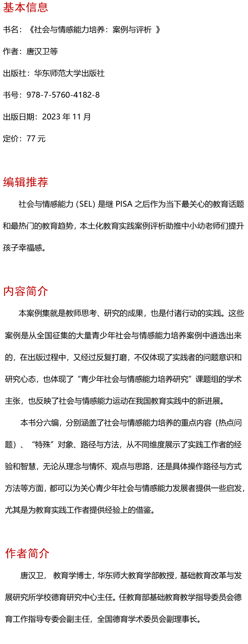 本案例集就是教师思考、研究的成果,也是付诸行动的实践。这些案例是从全国征集的大量青少年社会与情感能力培养案例中遴选出来的,在出版过程中,又经过反复打磨,不仅体现了实践者的问题意识和研究心态,也体现了“青少年社会与情感能力培养研究”课题组的学术主张,也反映了社会与情感能力运动在我国教育实践中的新进展。本书分六编,分别涵盖了社会与情感能力培养的重点内容(热点问题)、“特殊”对象、路径与方法,从不同维度展示了实践工作者的经验和智慧,无论从理念与情怀、观点与思路,还是具体操作路径与方式方法等方面,都可以为关心青少年社会与情感能力发展者提供一些启发,尤其是为教育实践工作者提供经验上的借鉴。