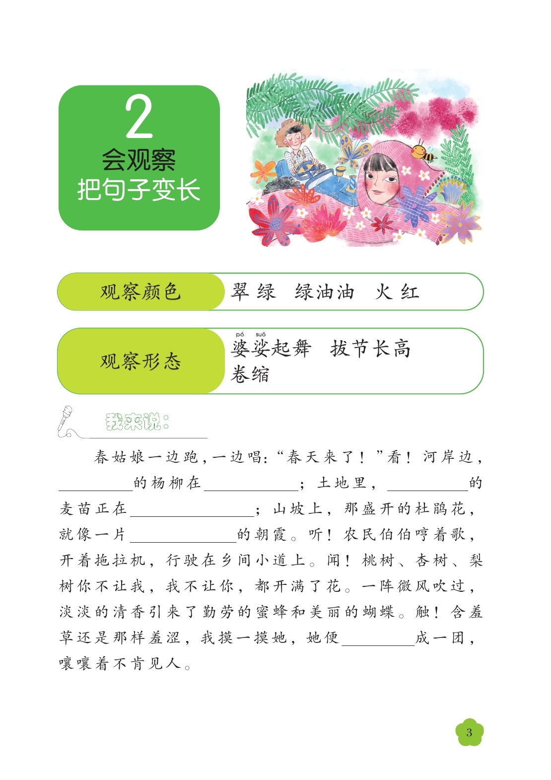 讲讲老师: 立小言 , 你再观察一下,春姑娘在哪里,她在干什么呢?