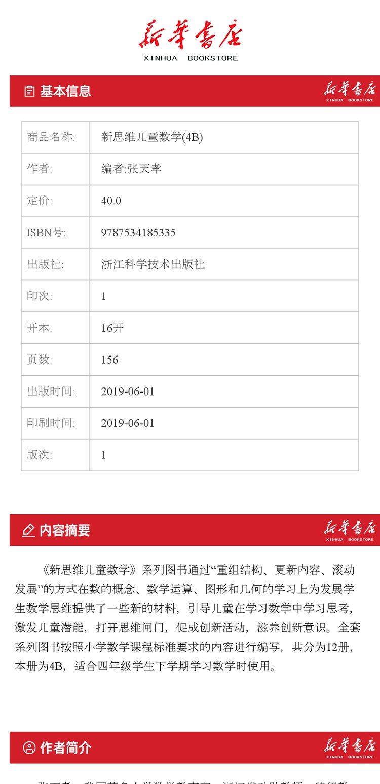 【新华书店旗舰店官网】正版 新思维儿童数学(4B)四年级下张天孝小学生数学能力训练浙江科学技术出版社课后练习学数学长智慧