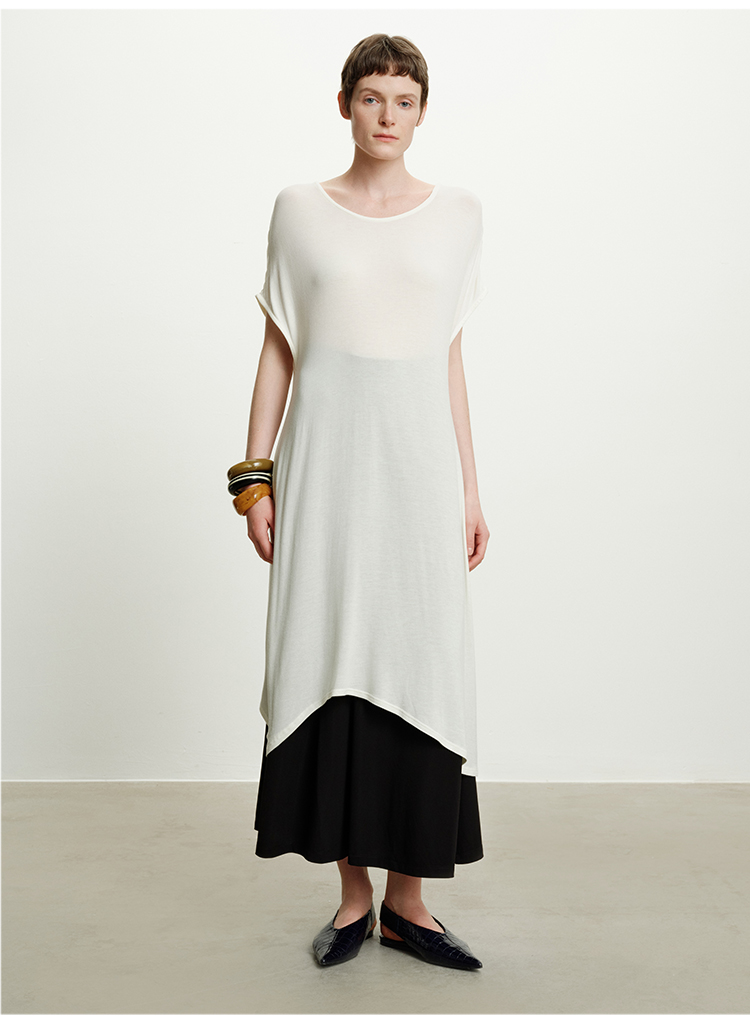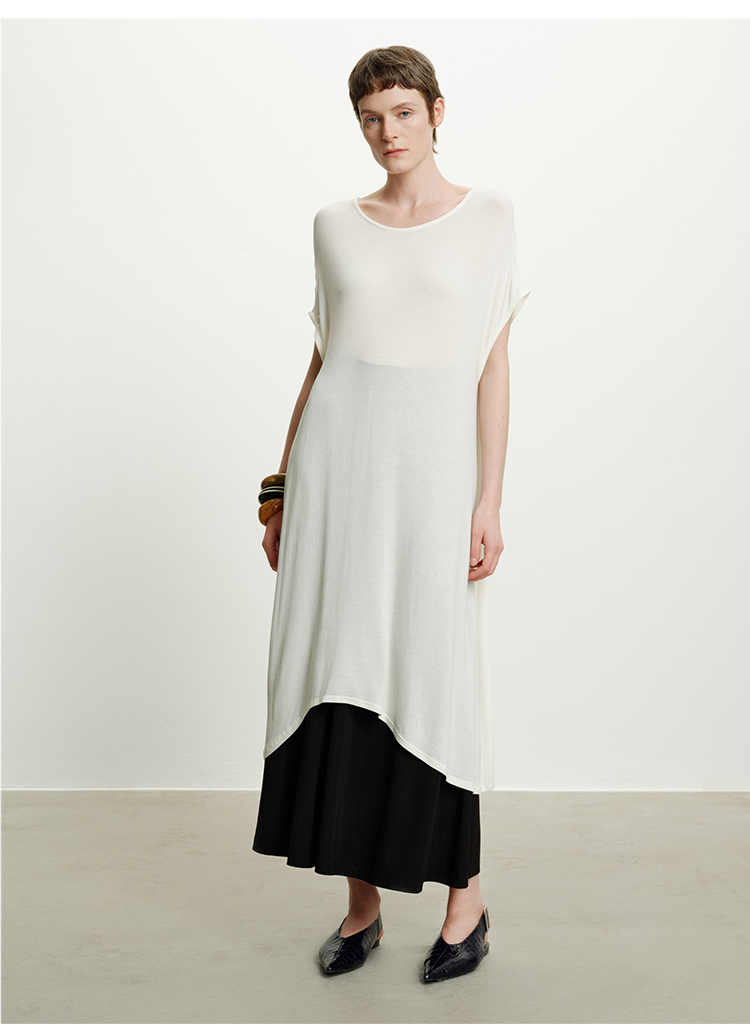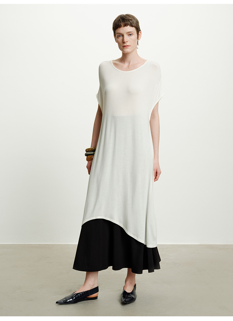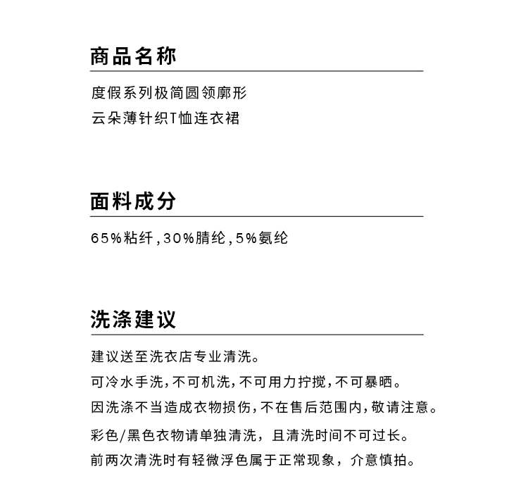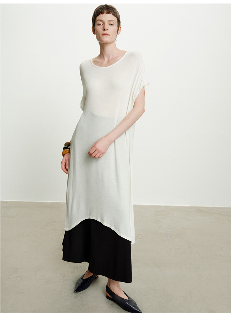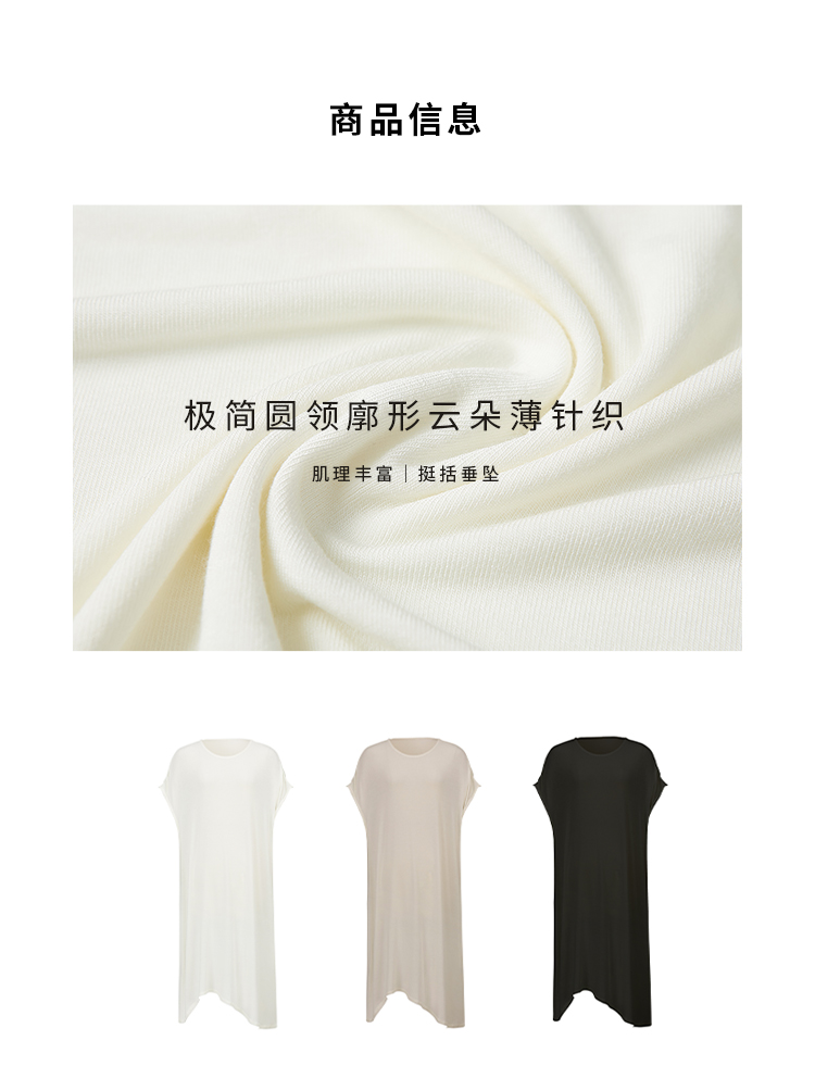 HIDEMI 度假系列极简圆领廓形云朵薄针织T恤连衣裙 黑色/白色/豆乳色