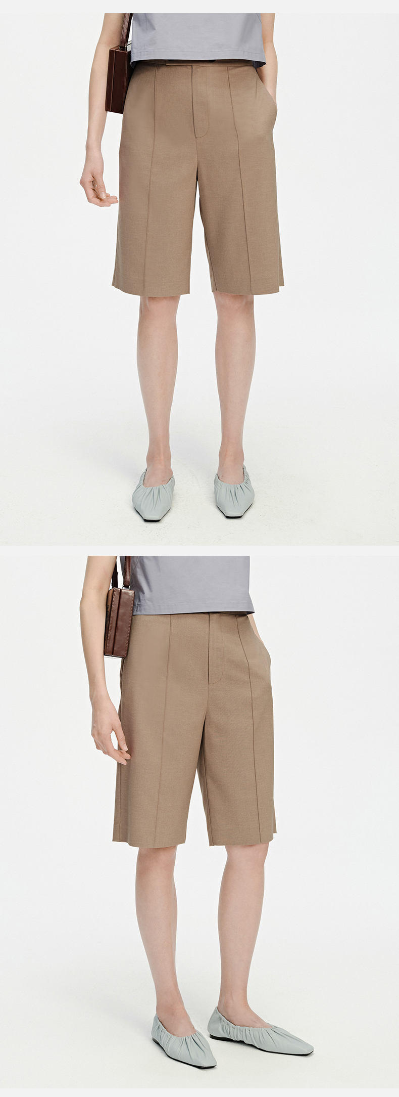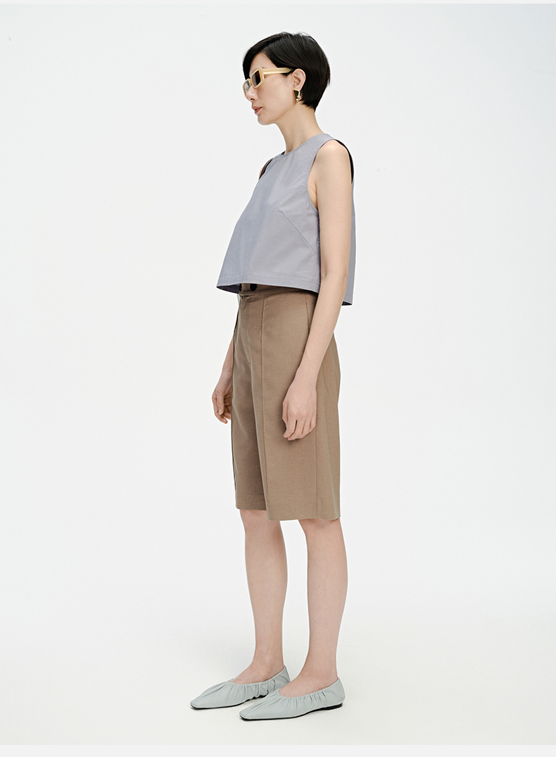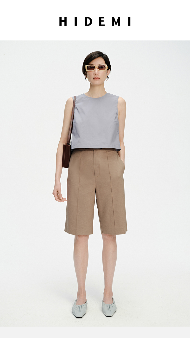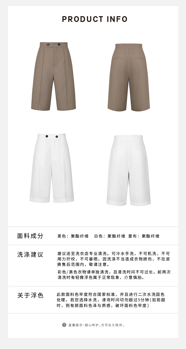 HIDEMI 两粒扣纤维显瘦西裤中短裤 奶茶色/白色
