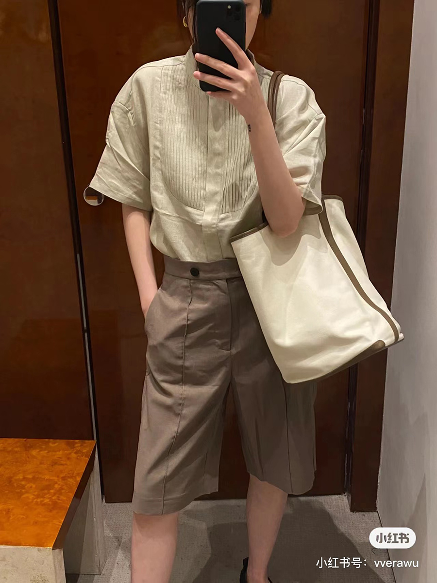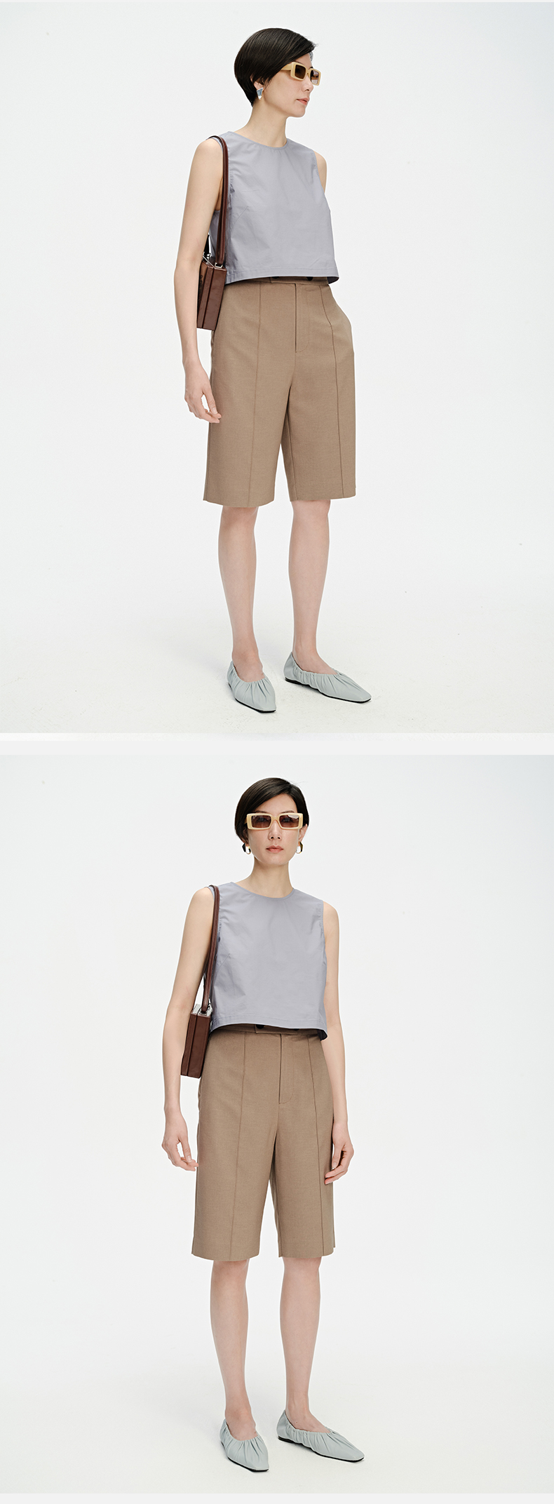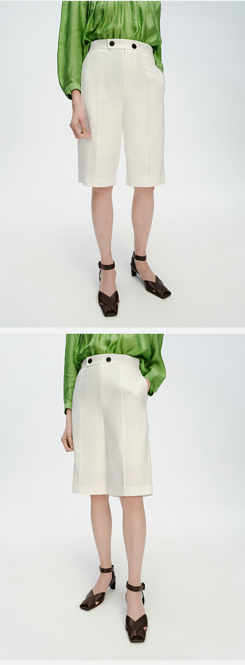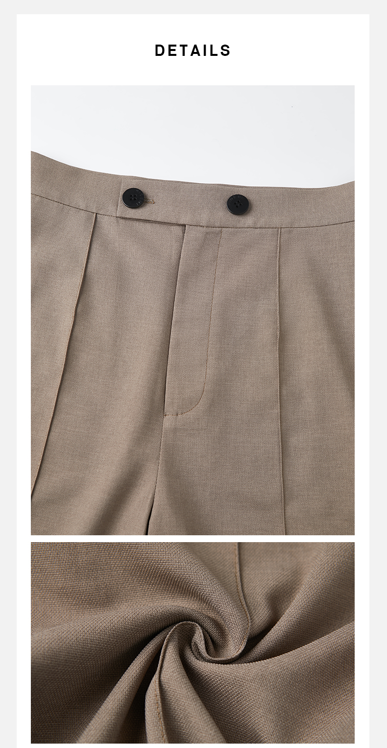HIDEMI 两粒扣纤维显瘦西裤中短裤 奶茶色/白色