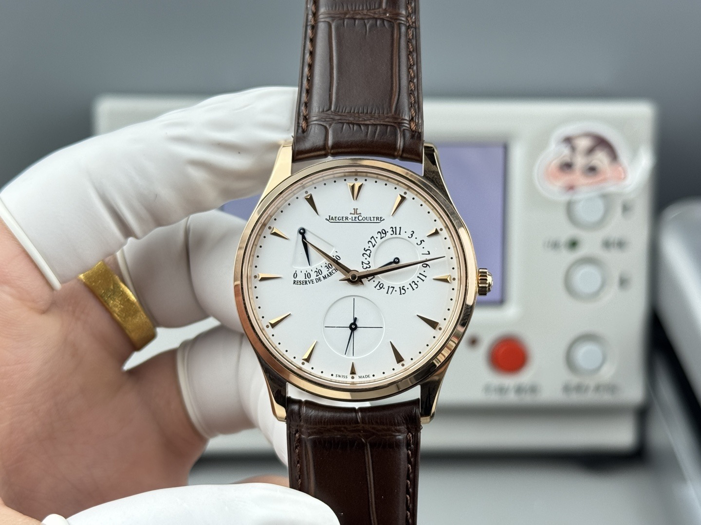 表扣:针扣【GF积家小丑】Master Ultra Thin Réserve de Marche超薄大师系列动力储存显示腕表将纯美线条与纤薄的精钢表壳完美融合,并搭载多项精妙的复杂功能,与优雅的表盘相得益彰,风格优雅大气,与男性手腕和谐搭配。