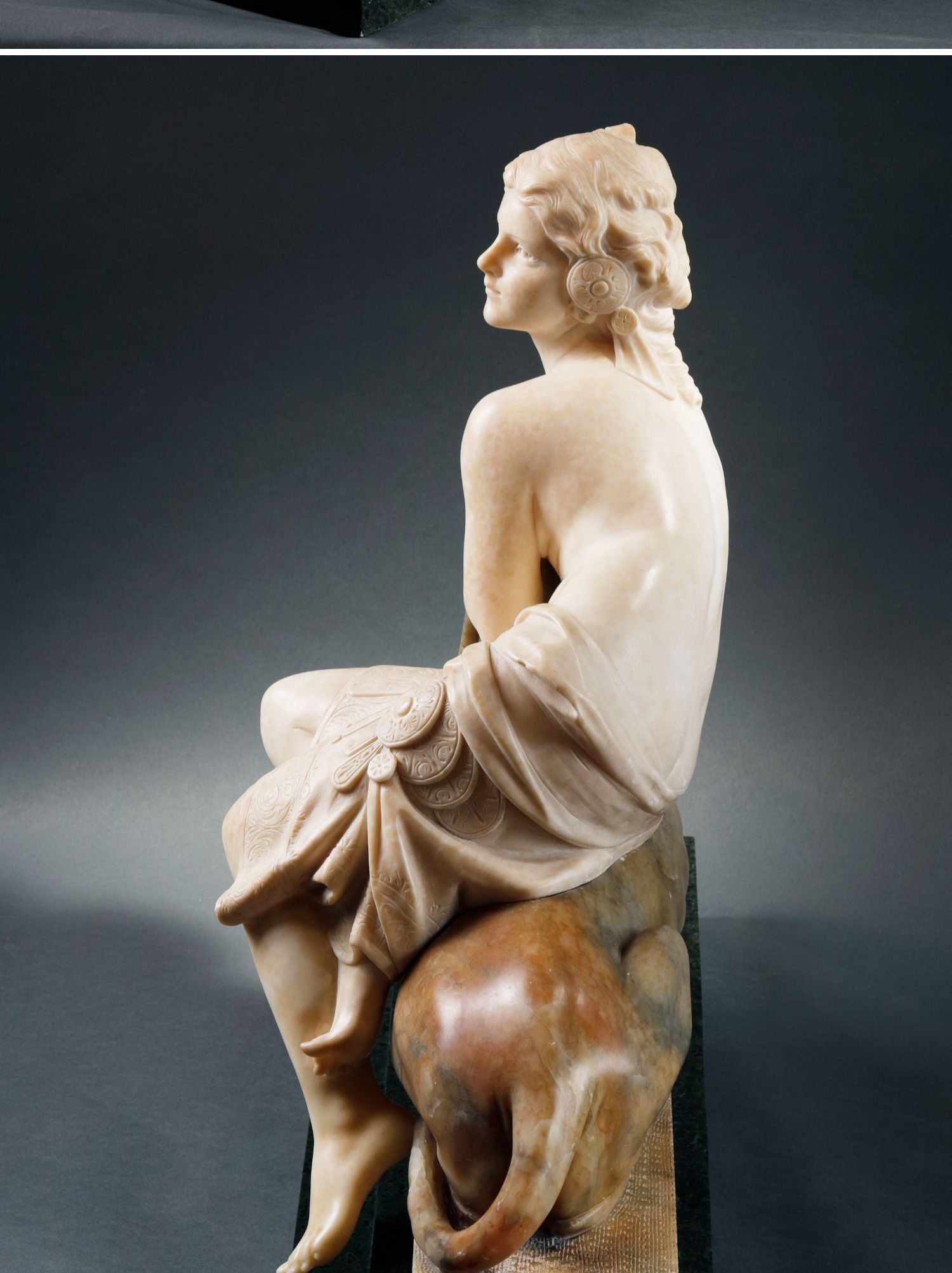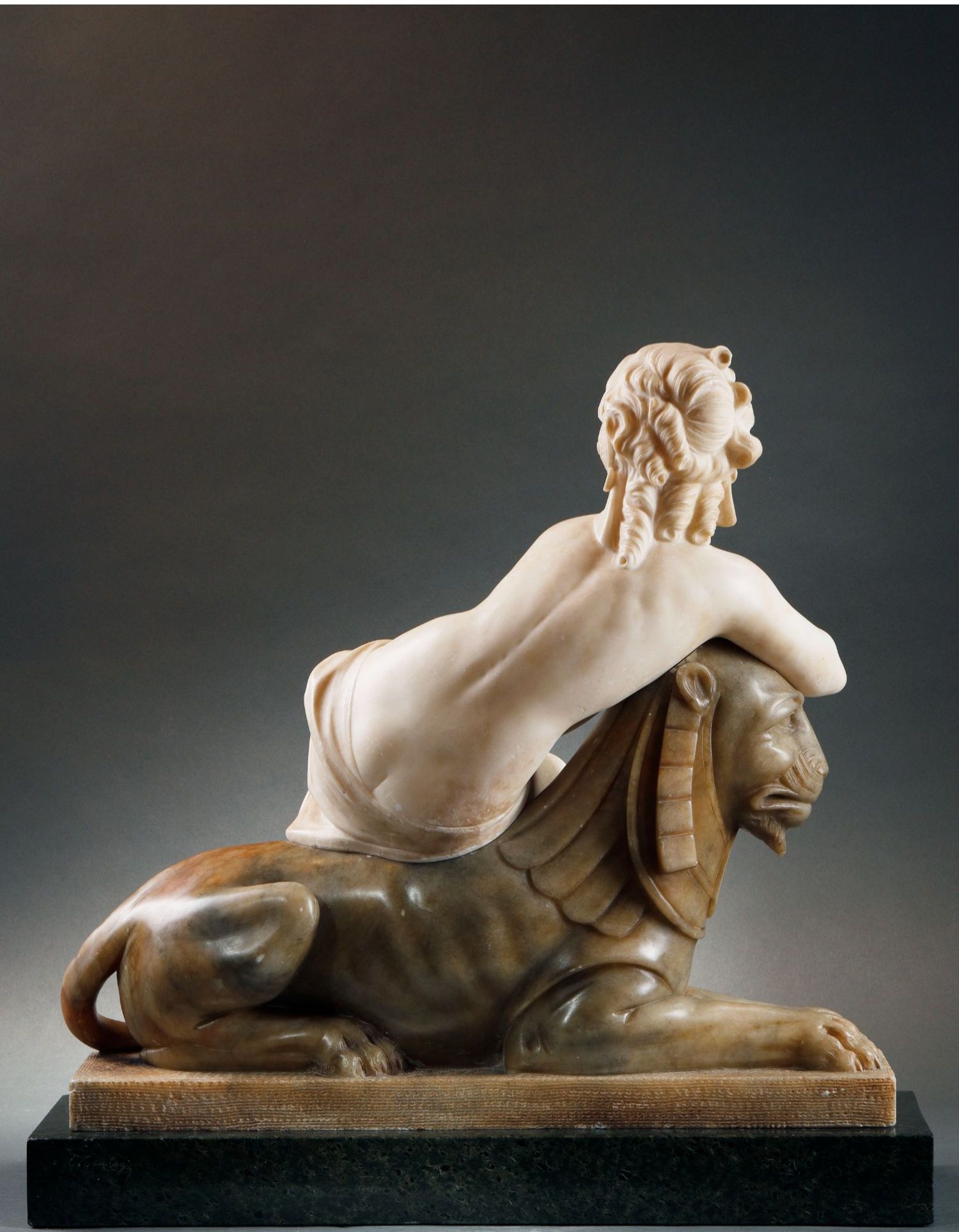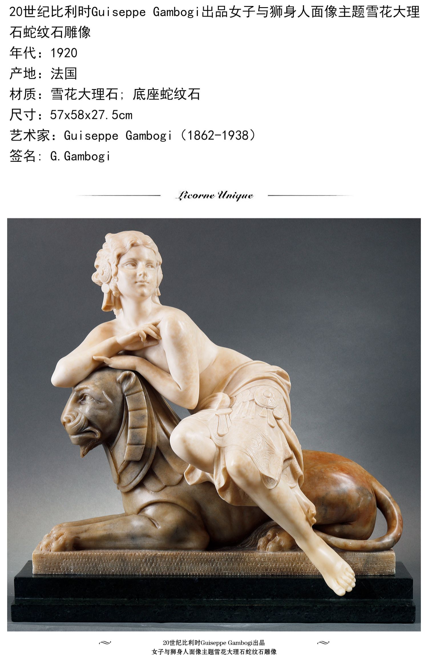 独角鹿西洋古董雕塑女子与狮身人面像主题雪花大理石蛇纹石雕像