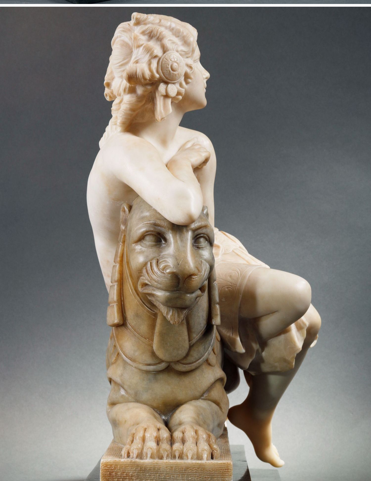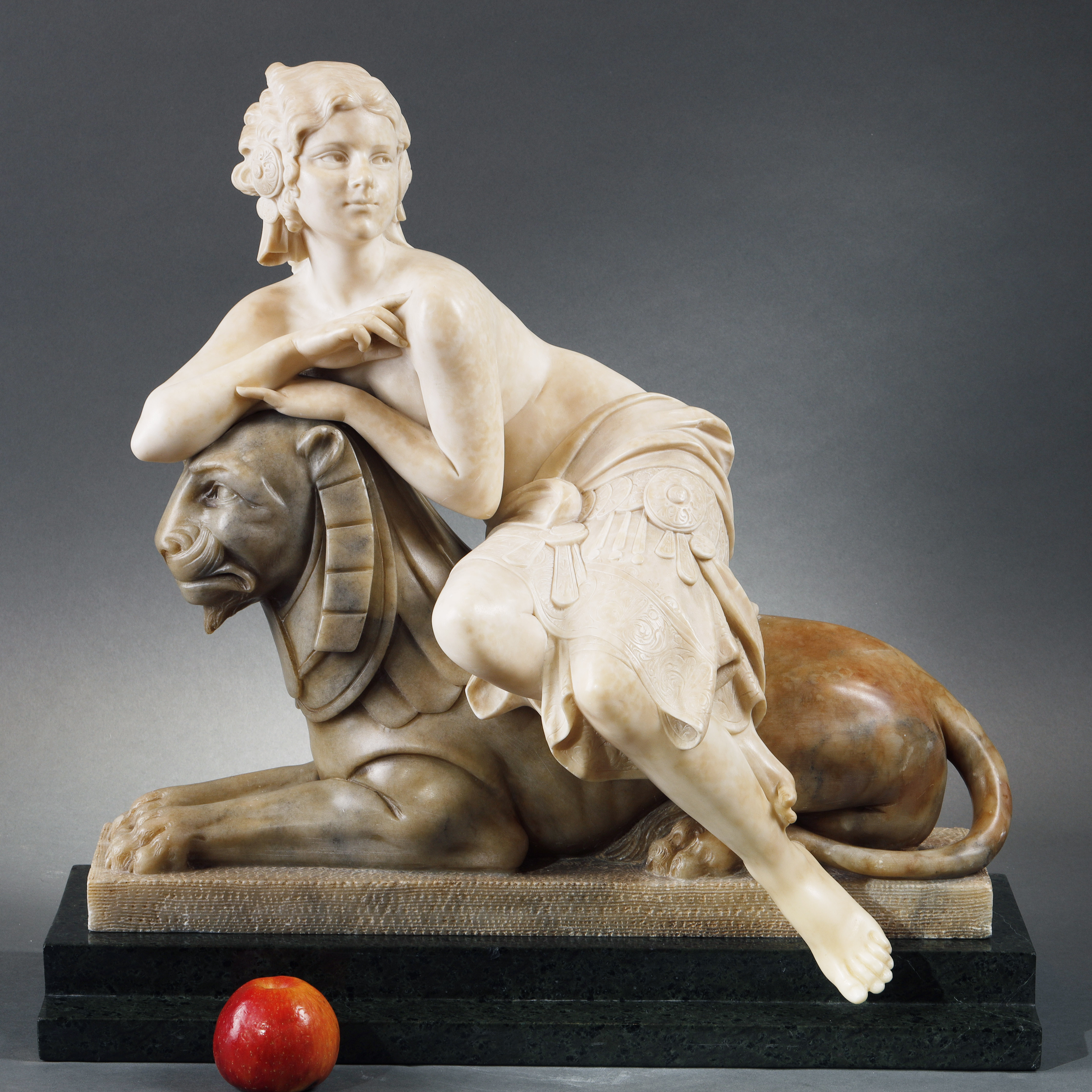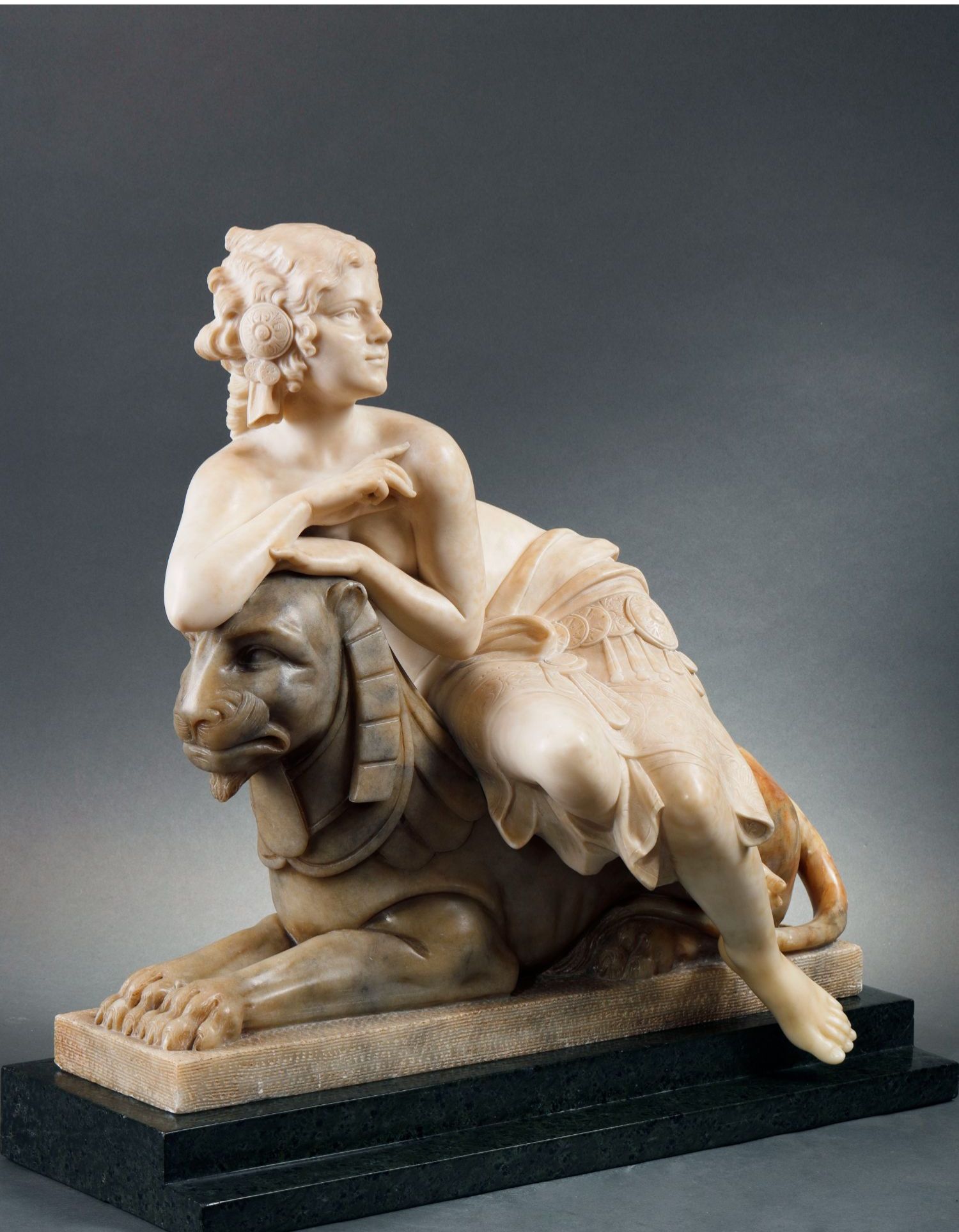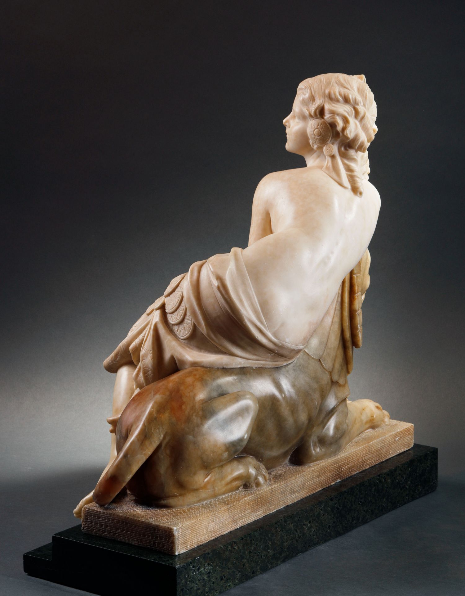 独角鹿西洋古董雕塑女子与狮身人面像主题雪花大理石蛇纹石雕像