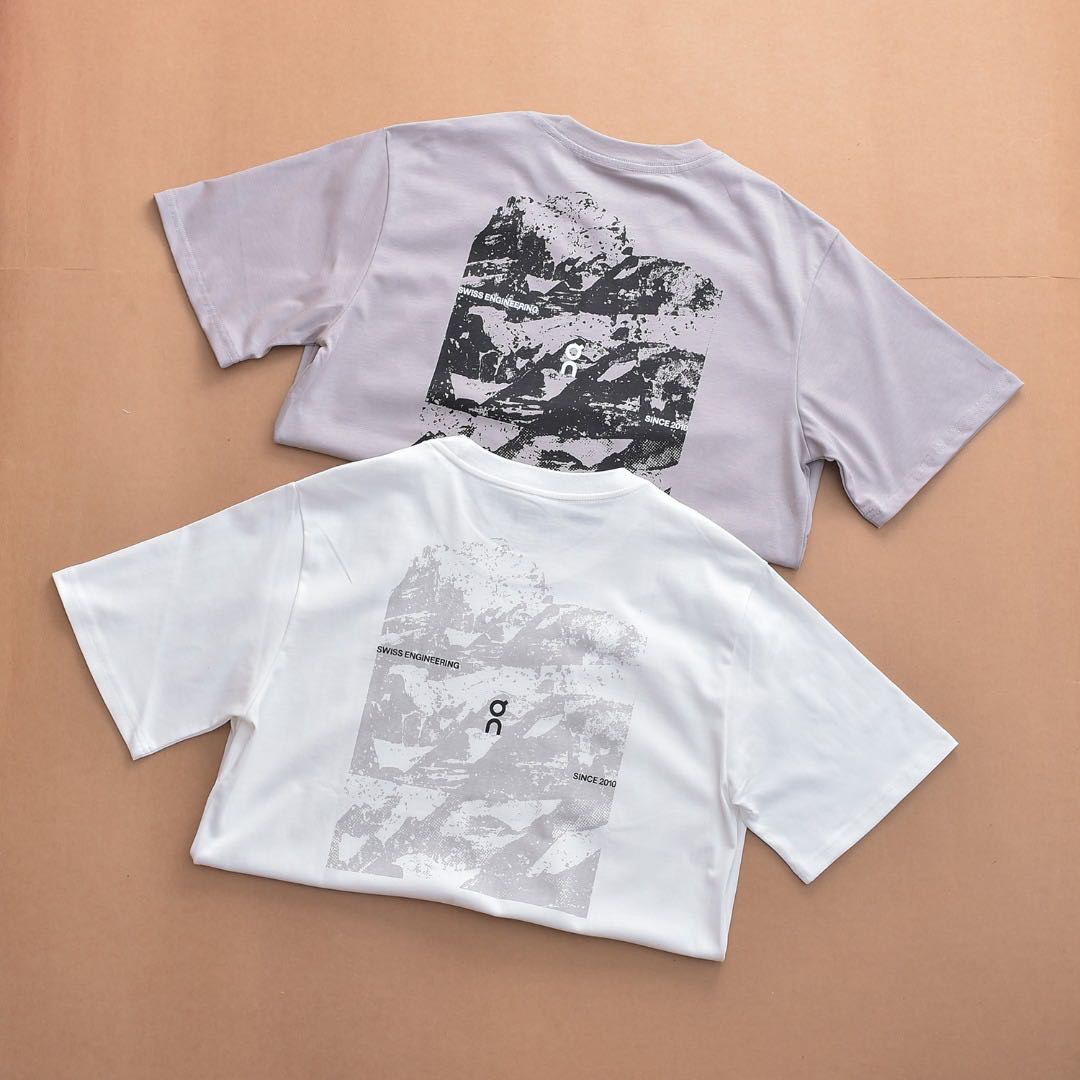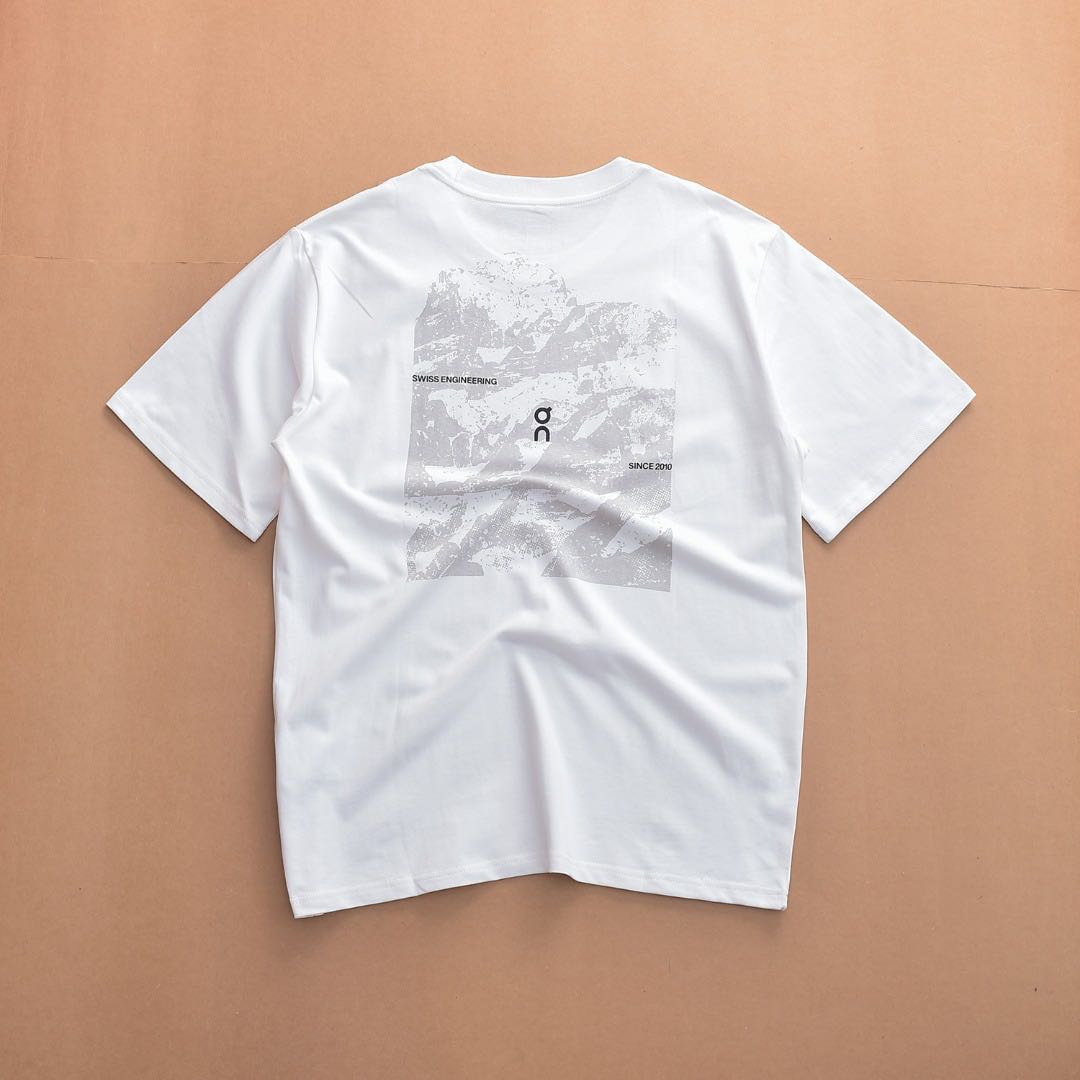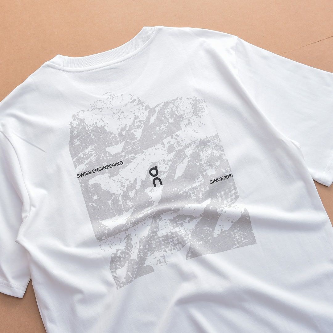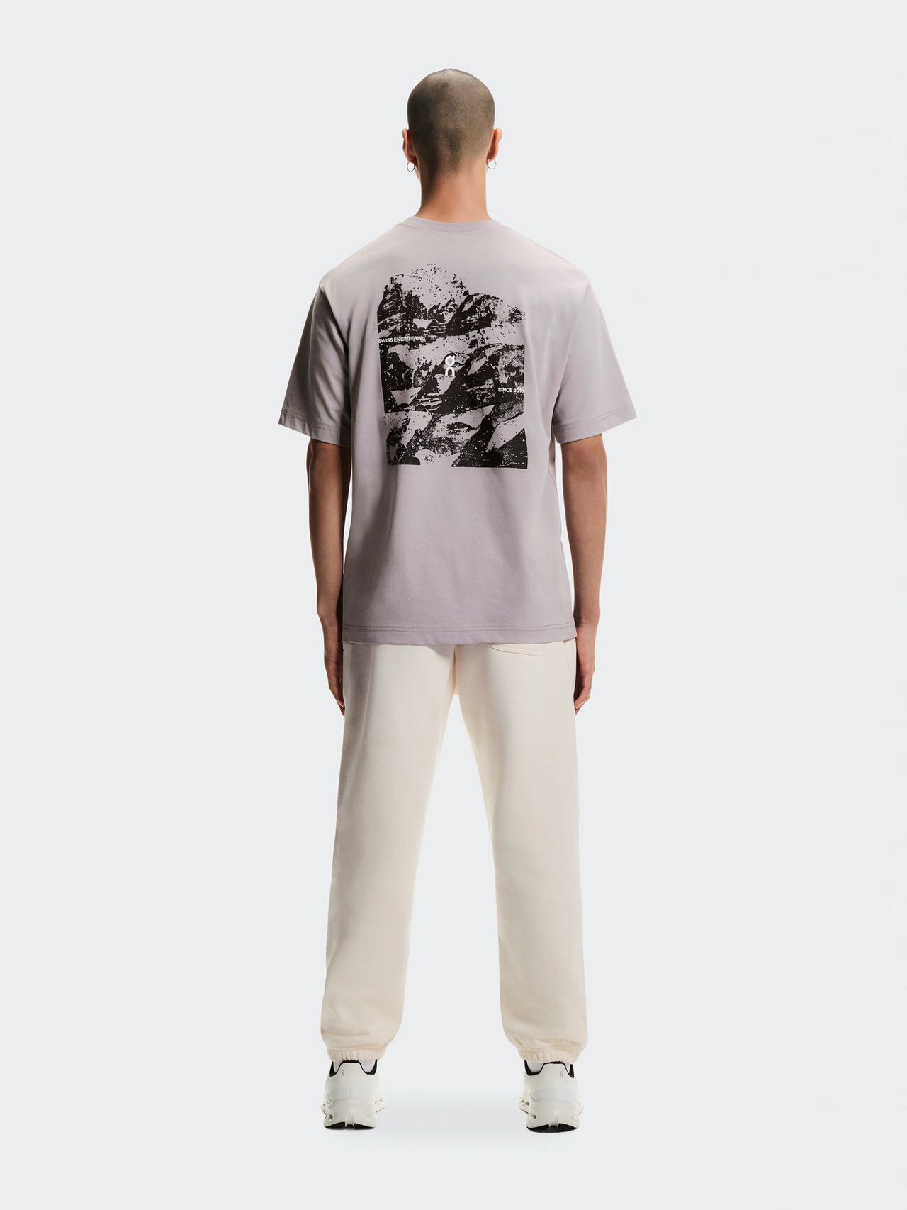 男士日常休闲日常圆领短袖T恤 棉质面料舒适 胸前刺绣小Logo,背面山系印花图案。